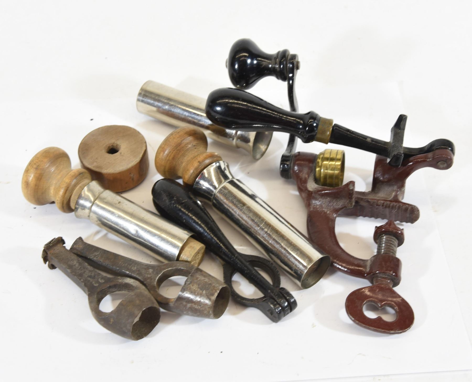 Two wooden primer seaters. One roll crimper. One 10ga primer seater. One wooden shell holder. Two wad cutters.