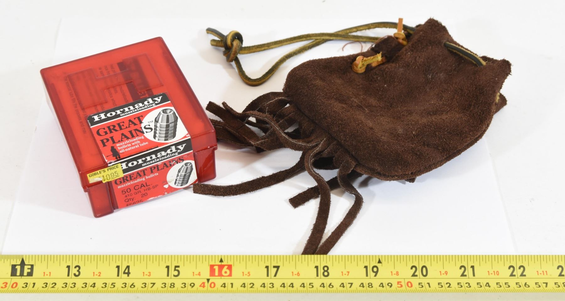 One 13-piece box of Hornady 50cal 410gr HB-SP maxi balls. One small leather possibles bag.