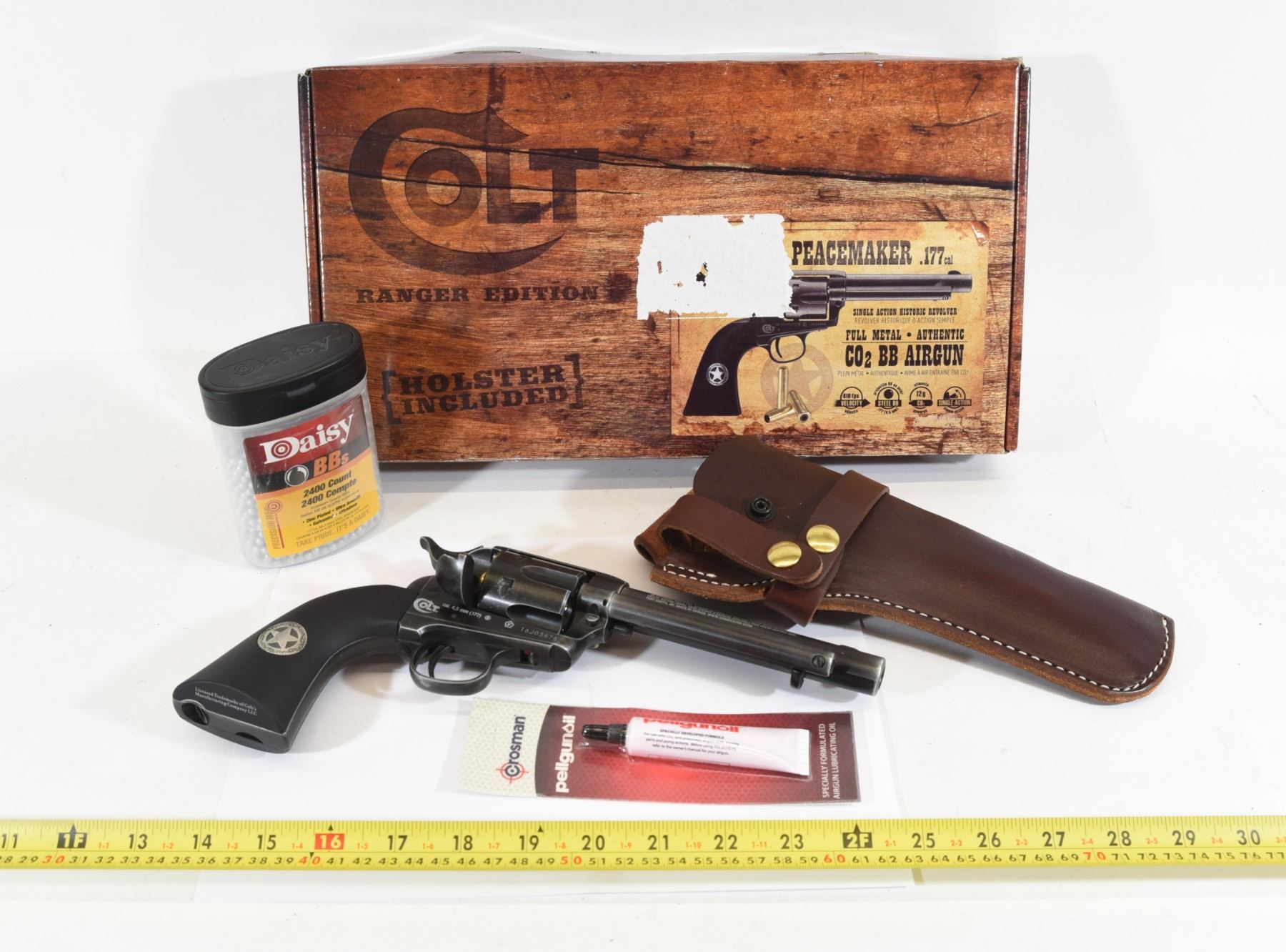 Colt Ranger Edition Peacemaker SAA .177cal BB/pellet pistol. Unknown quantity bottle of Daisy BBs. Crosman Pellgun oil new in package.
