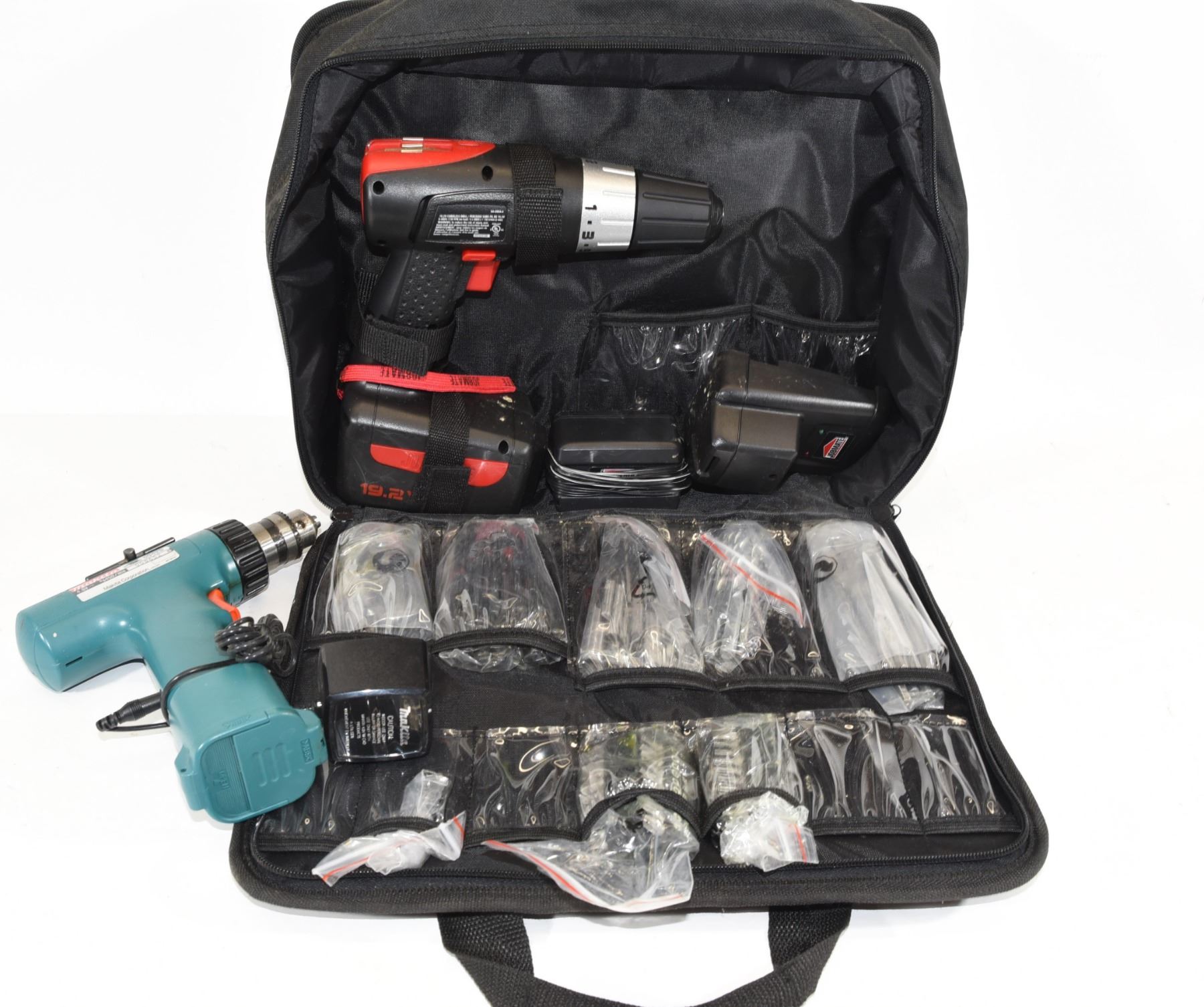 19.2 volt drill with an assortment of drill bits, drivers and screwdriver bits. In working condition with charger and one battery. Also a Makita 4.8 volt drill with charger - unknown functionality.