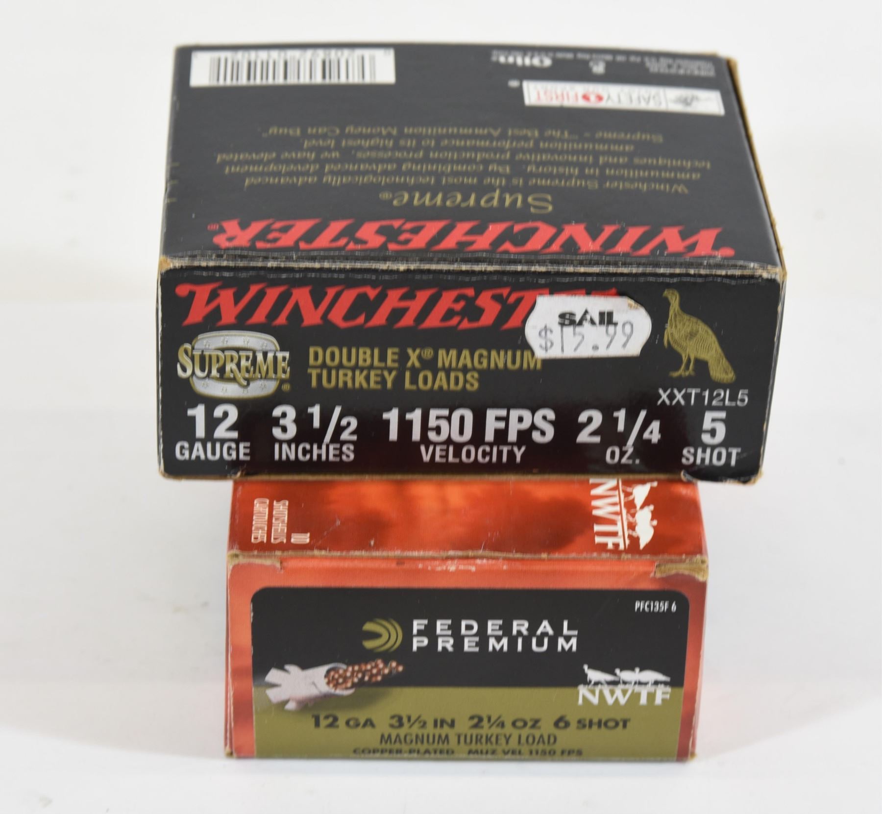 One 7-round box of Federal Premium Magnum Turkey Load 12ga 3.5" #6. One box of Winchester Supreme 12ga 3.5" #5 with 5 rounds of Winchester and 1 round of Remington.