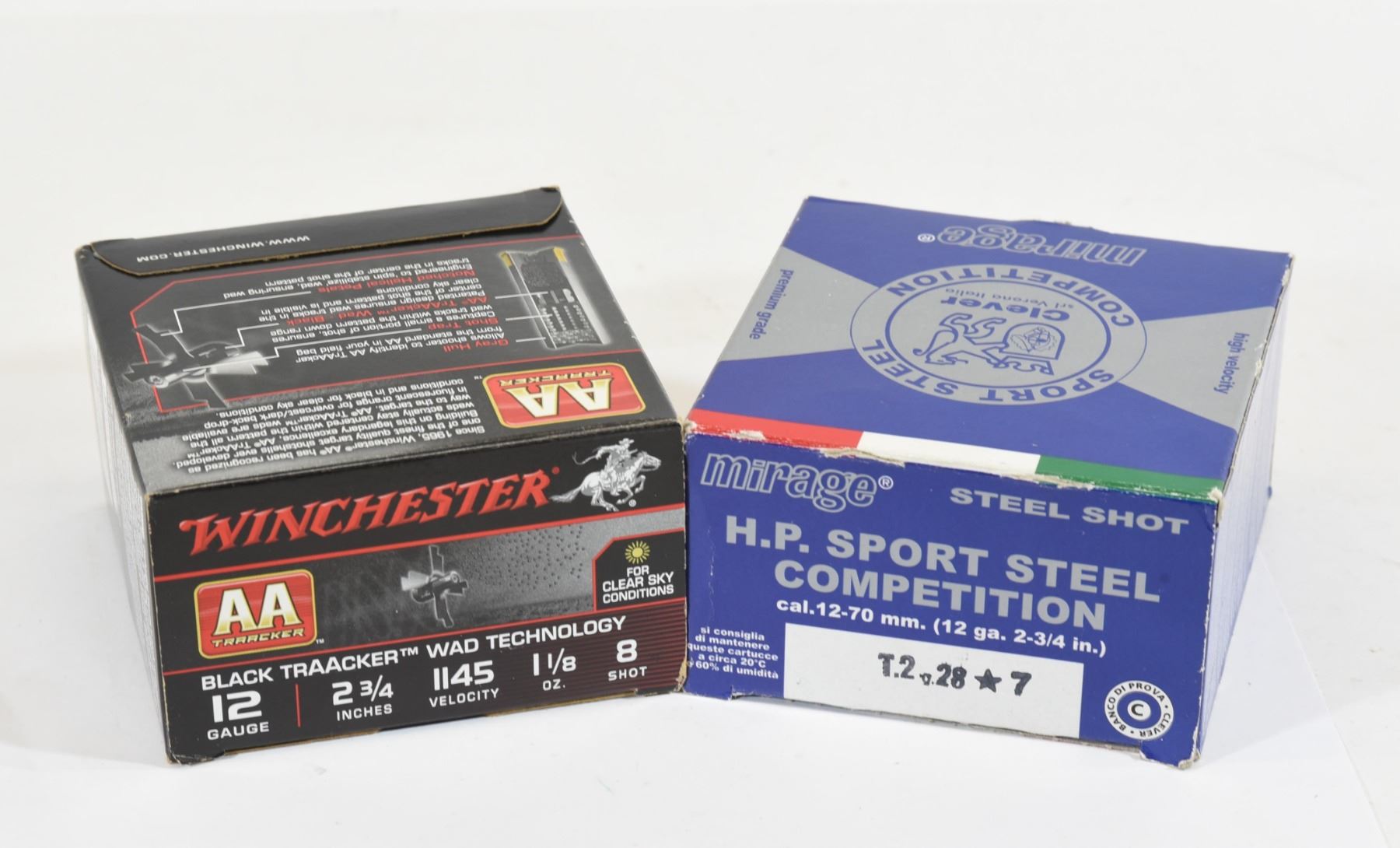 One 25-round box of Mirage HP Sport Steel Competition 12ga 2 3/4" #7. One 25-round box of Winchester AA Tracker 12ga 2 3/4" #8.
