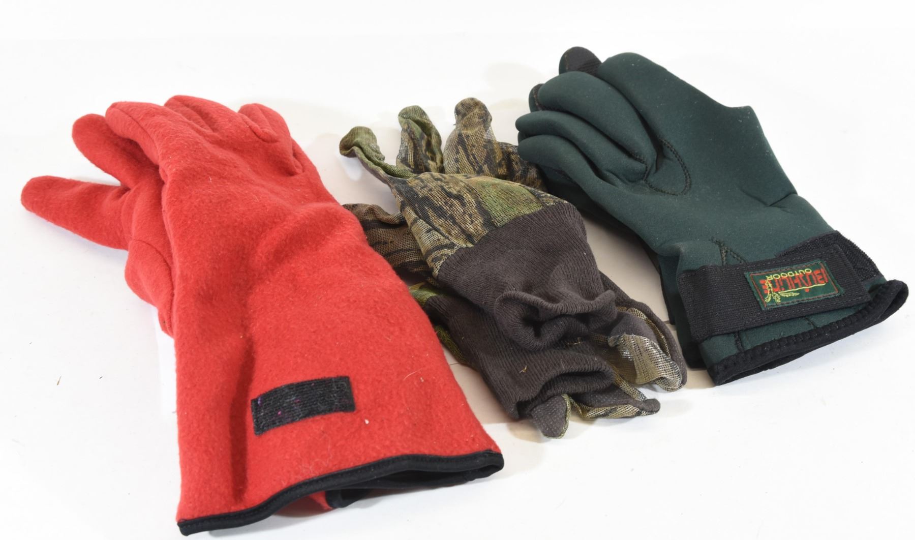 1) Neopreen Bushline green gloves in size XL. 2) Hunter's Specialties camo hunting gloves. 3) Red fleece gloves.