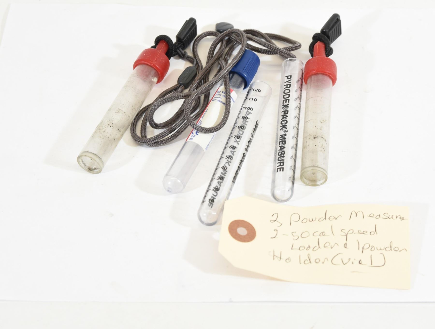 1) 2 powder measurers. 2) 2 - 50 caliber speed loaders. 3) 1 powder holder vial.
