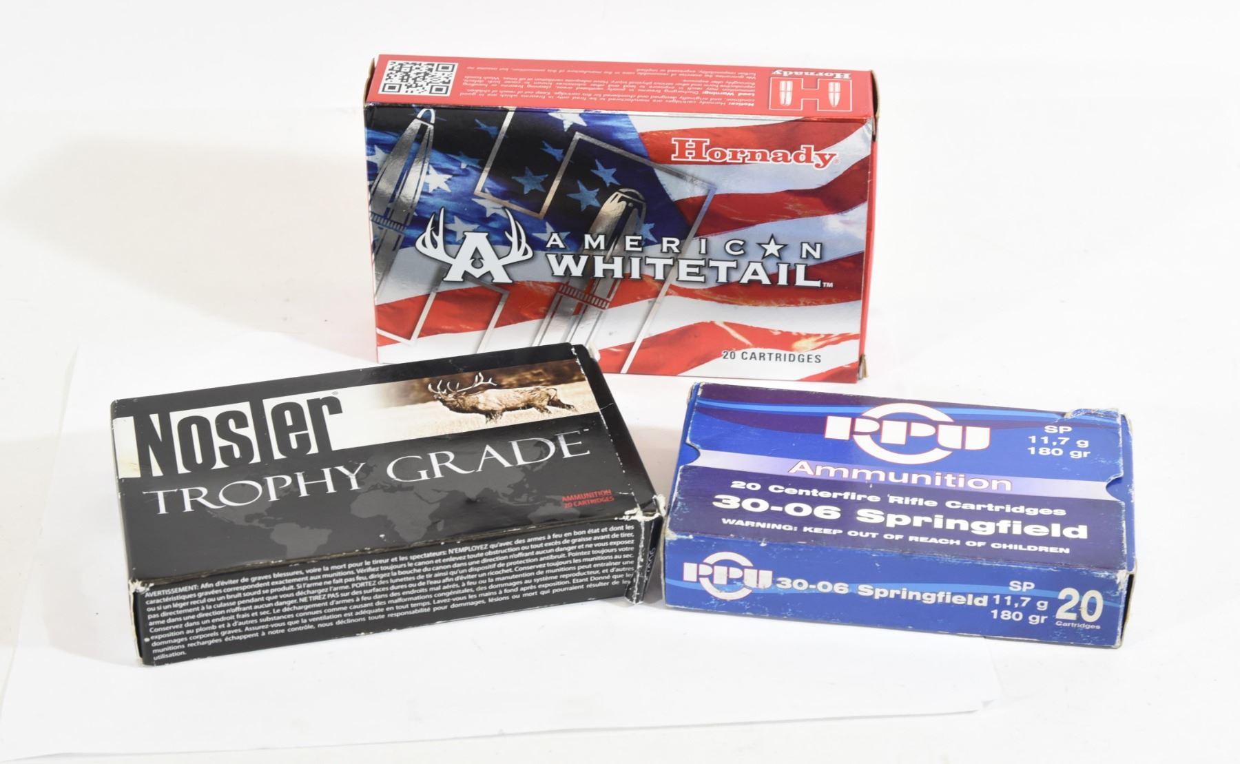 1) 13 rounds Hornady American Whitetail 300 Win. Mag. 180 grain. 2) 13 rounds Nosler Trophy Grade180 grain. 3) 20 rounds mixed 30-06 ammunition.