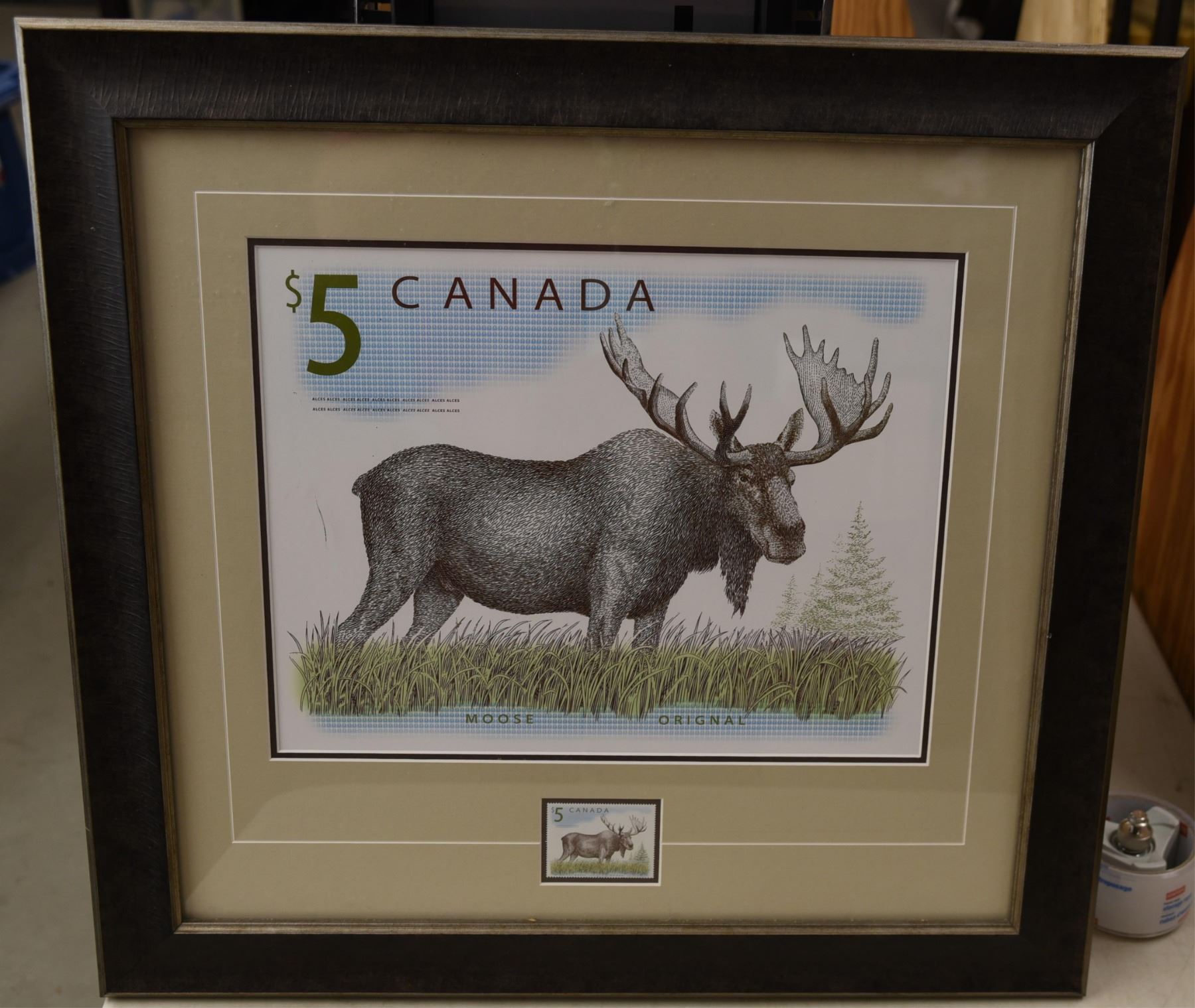 Three Majestic Moose stamps with large framed print. One 28g 99.99% pure silver Majestic Moose coin (one stamp is in frame with print). Comes with certificate of authenticity and wooden display case. WILL NOT SHIP. MUST PICK UP.