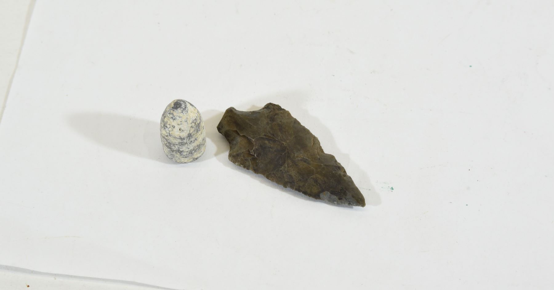 1) Arrow head is from the Simcoe area. 2 1/8" long x 1" wide. 2) The bullet is a 50 caliber Picket ball bullet.