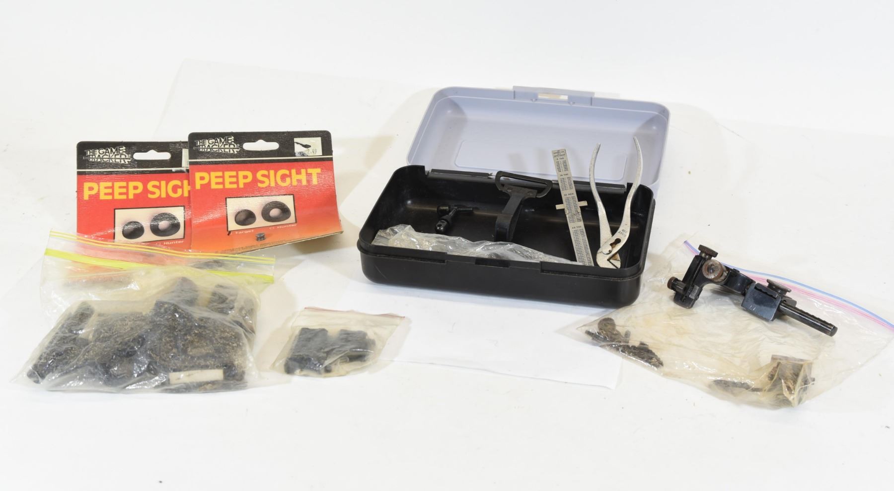 1) Peep sight target for bows. 2) Lyman peep sight. 3) Bag of sight parts. 4) Bag of Scope rings. 5) 94 top mount base.