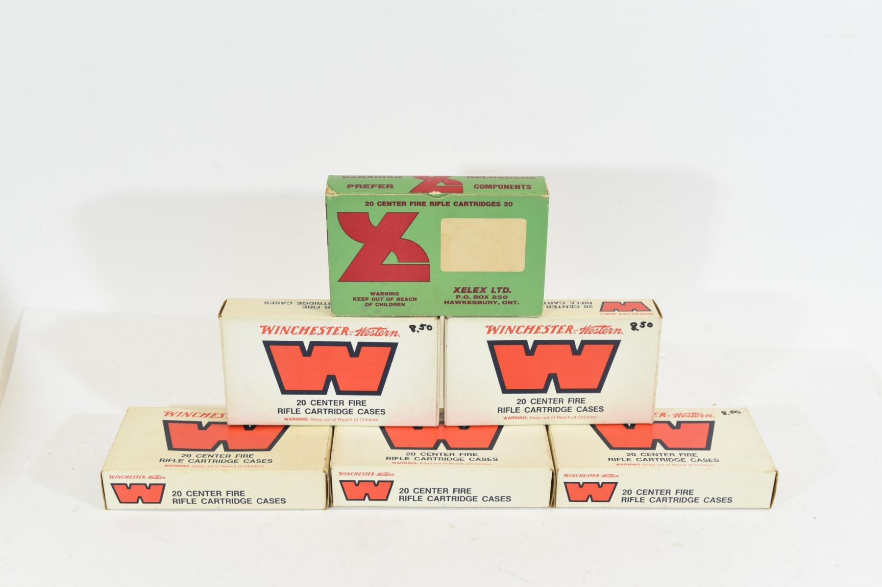 5 boxes of 20 new Winchester unprimed casings and 1 box of Xelex.