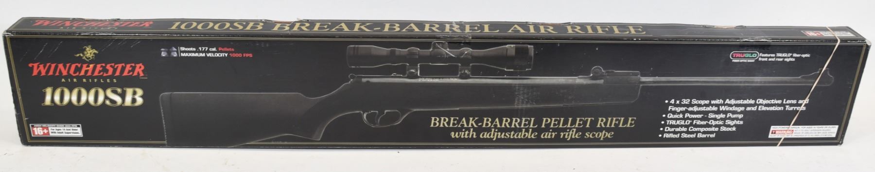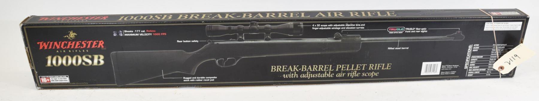 Non-restricted Winchester model 1000 SB 177 caliber including 4x32 scope with adjustable objective lens and finger-adjustable windage and elevation turrets. Action: break-barrel spring air. Caliber: .177 (4.5 mm) pellet. Sights: Truglo fiber-optic front, fiber-optic micro-adjustable rear. Adjustable air rifle scope. Stock/forearm: composite with rubber recoil pad. Capacity: singleshot. Safety: rear button safety. Barrel: rifled steel, solid steel shroud.