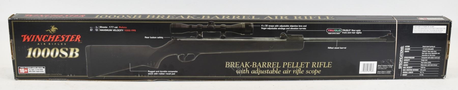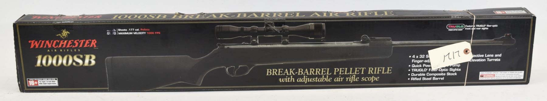 Non-restricted Winchester model 1000 SB 177 caliber including 4x32 scope with adjustable objective lens and finger-adjustable windage and elevation turrets. Action: break-barrel spring air. Caliber: .177 (4.5 mm) pellet. Sights: Truglo fiber-optic front, fiber-optic micro-adjustable rear. Adjustable air rifle scope. Stock/forearm: composite with rubber recoil pad. Capacity: singleshot. Safety: rear button safety. Barrel: rifled steel, solid steel shroud.