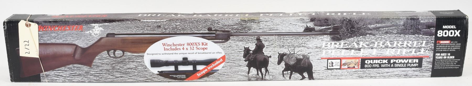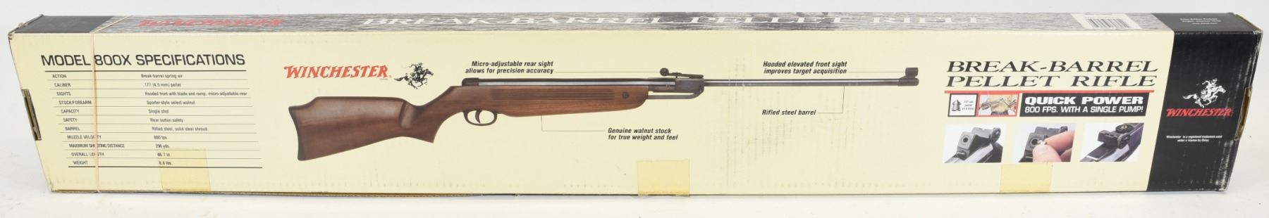 Non-restricted Winchester air rifle model 800x .177 caliber with scope. Specifications: Action: break-barrel spring air. Caliber: .177 (4.5 mm) pellet. Sights: hooded front with blade and ramp, micro-adjustable rear. Stock: Sporter-style select walnut. Capacity: single shot. Safety: rear button safety. Barrel: rifled steel, solid steel shroud. Muzzle velocity: 800 fps. Maximum shooting distance: 296 yards. Overall length: 46.7 in. Weight: 6.6 lbs.
