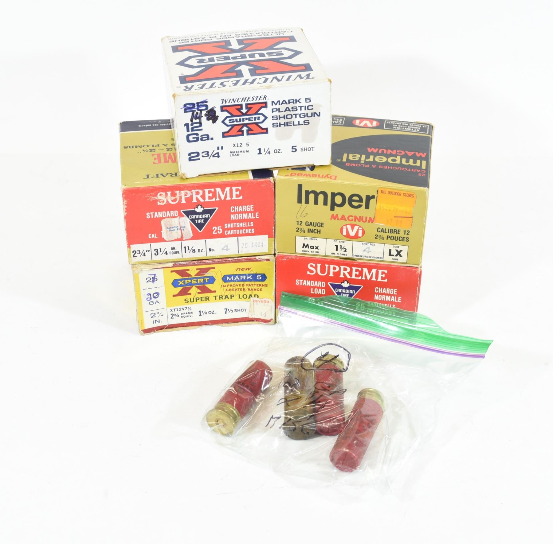 1) 14 rounds of Winchester 12ga 2 3/4" #5 shot. 2) 16 rounds of Imperial 12ga 2 3/4" #4 shot. 3) 25 rounds of Supreme 12ga 2 3/4" #4 shot. 4) 25 rounds of Supreme 12ga 2 3/4" #6 shot. 5) 4 rounds of mixed 12ga 2 3/4". 6) 25 rounds of Remington 20ga 2 3/4" #7.5 shot.