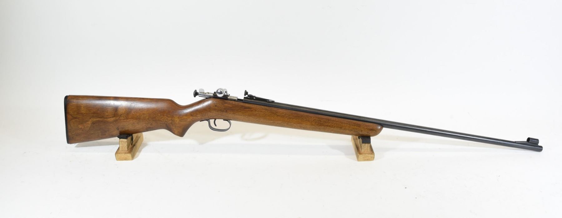Non-restricted, 22LR, bolt action single shot., SN NA. Wood stock is in good condition aside from few surface dents and one deep dent on top of butt stock.. Bluing is turning gray with surface pitting from patina. Bore is excellent. Rifle has a factory peep sight.