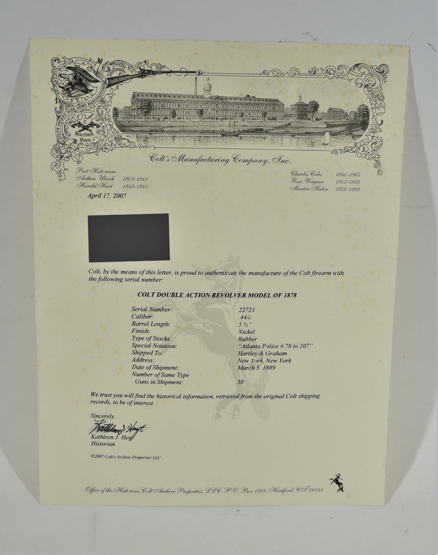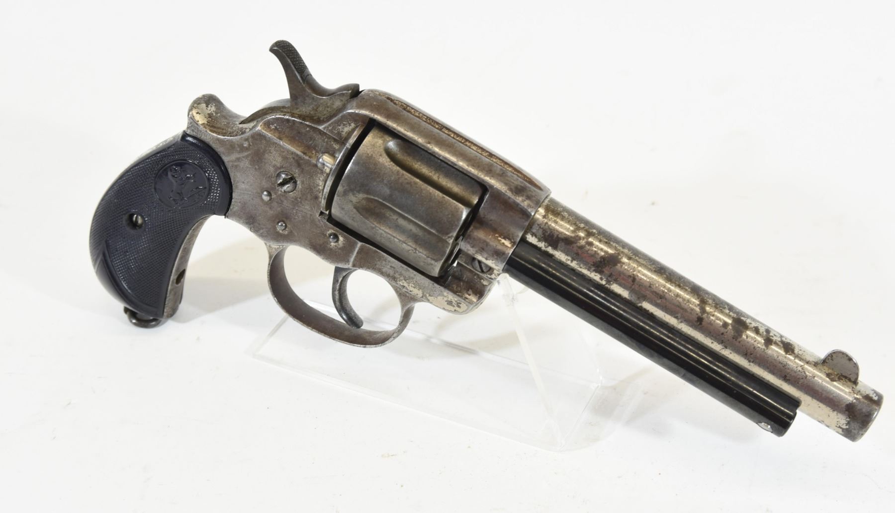 Restricted, double action, 44 caliber, 5 1/2" barrel, SN 22721. Grips are good. Nickel finish is turning brown with some rust spots. Bore has some pitting, rifling is evident, cylinder has a bit of play, ejector tube is not original. Comes with a factory letter from Colt. Back strap is marked Atlanta Police No. 84.