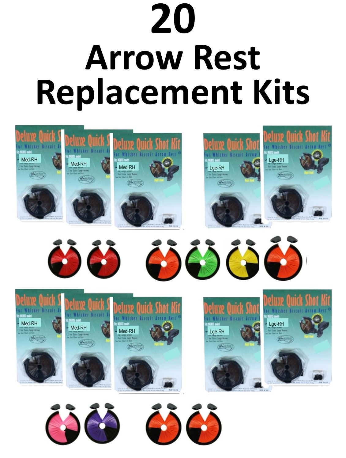 20 x Rest Replacement kits, 10 x Deluxe Quick Shot Kit, 6-M RH, 4-Large RH, 10 x Trophy Ridge Whisker Biscuit, 2-Red, 1-Green, 4-Orange, 1-Yellow, 1-Pink, 1-Purple