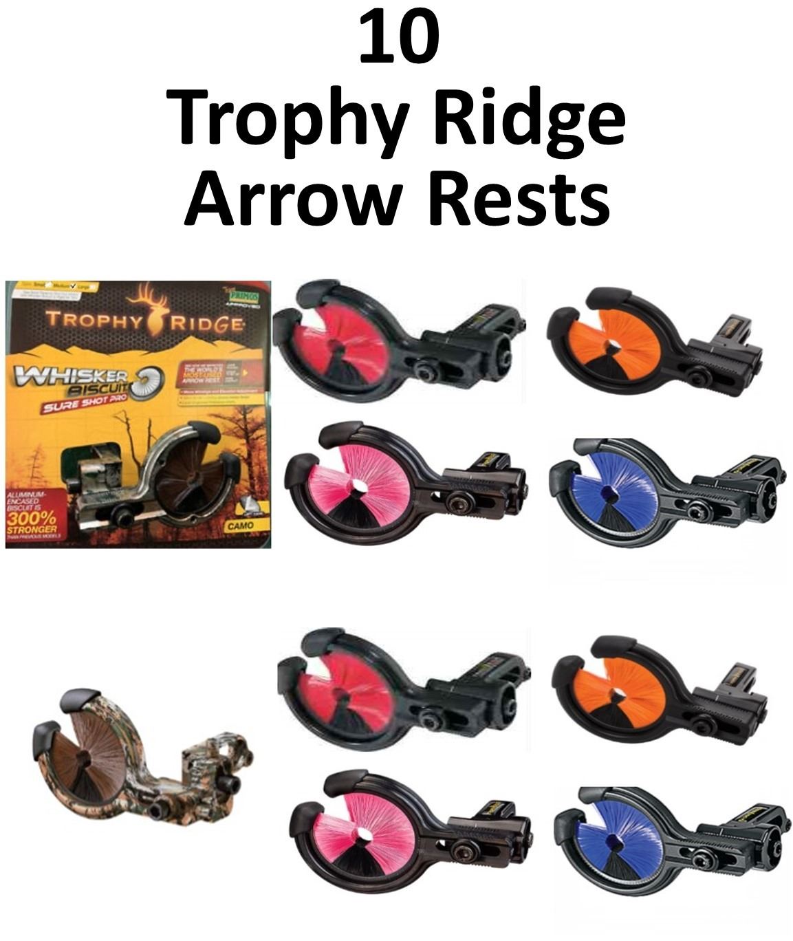 10 x Trophy Ridge Rests, 8 x Kill Shot Medium, 2-Purple, 2-Red, 2-Orange, 2-Pink, 1 x Sure Shot Pro LH Camo, 1 x Power Shot Black RH