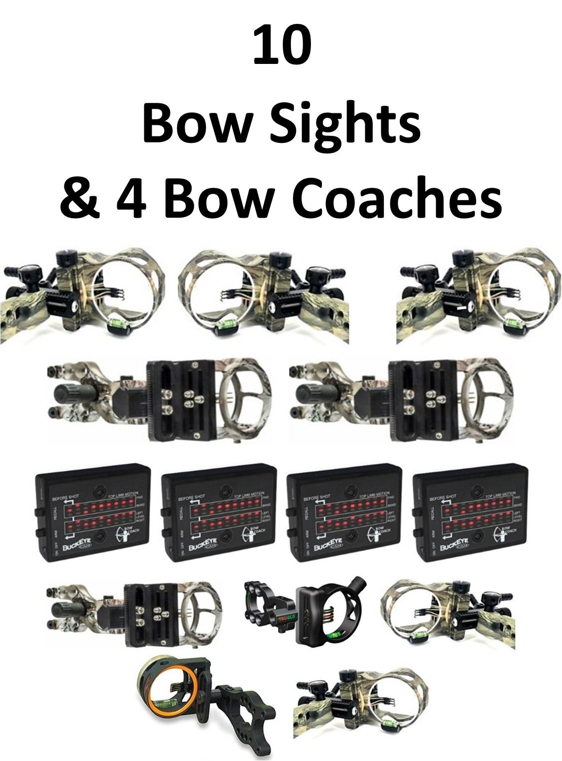 10 x Sights & 10 x Bow Coachs, 5 x G5 Optix, 1-SE .029 RH, 1-SE .029 LH, 2- SE .019 RH, 1-SE .029 LH, 3 x Axion Soul Hunter 3 Pin Lost Camo AT, Rite-Site XS 5 Light 19 Black, Grave Dancer 3 pin .019