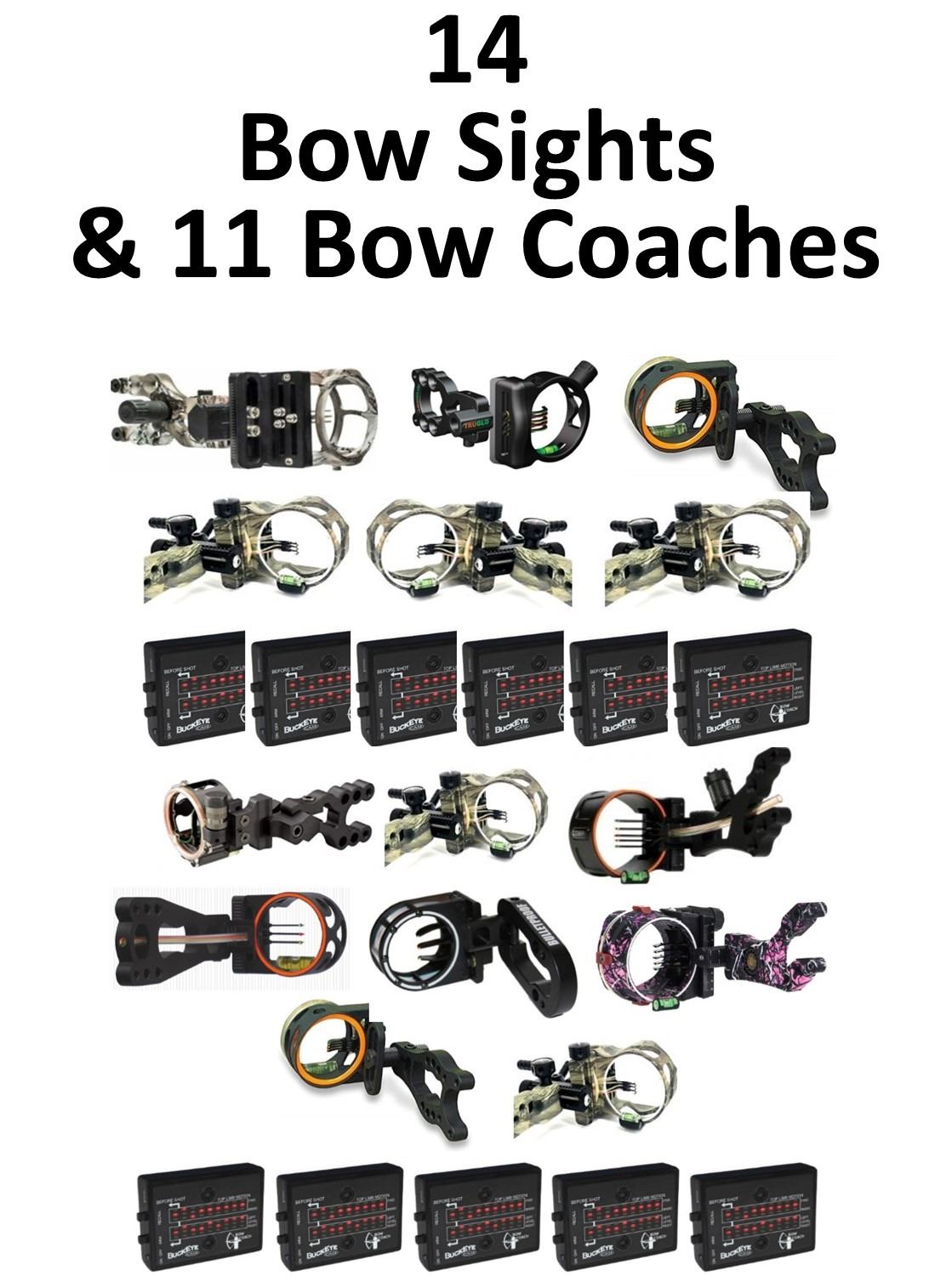 14 x Sights & 11 x Bow Coachs, Axion Soul Hunter 3 Pin Lost Camo AT, Rite-Site XS 5 Light 19 Black, Grave Dancer 3 pin .019, Grave Dancer 3 pin .029, 4 x G5 Optix,1-SE .029 LH, 2-SE .019 RH, 1-XR LH, TR Alpha V-3 LH, G5 Optix SE LH .019 Pins 3 Pins, Cobra Smoke G2 5 pin XTRAG, Cobra Stealth Black LH, Spot Hogg 3 Pin Bullet Proof .019, Cobra Buckhead 5 Pin Toolless Muddy Girl