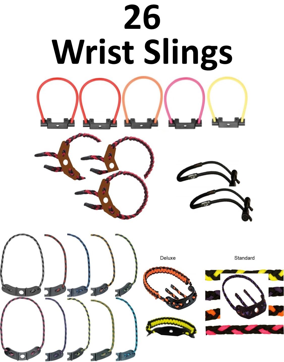 26 x Wrist Slings, 10 x Pine Ridge Kwik Slings, 1-Silver/Black, 1-Red/Black, 1-Blue/Black, 1-Orange/Black, 1-Green/Black, 1-Pink/Black, 1-Purple/Black, 1-Yellow/Black, 1-Camo, 1-Turquoise/Black, 5 x Pine Ridge Nitro Wrist Slings, 2-Red, 1-Orange, 1-Pink, 1-Yellow, 3 x Vista Braided Sling Red/Black, 2 x LOC Outdoorz Stiffy Sling MaXX Black, 4 x Blacks Creek Wrist Slings, 2 x Deluxe, 1-Orange/Black, 1-Yellow/Black, 4 x Standard, 1-Yellow/Black, 1-Purple/Black, 1-Orange/Black, 1-Pink/Black