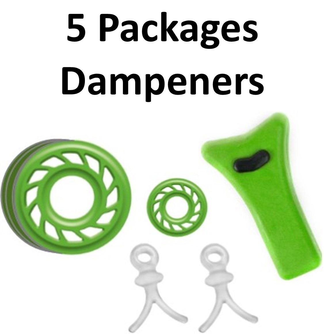 5 x Dampeners, 3 x Mathews, 1-3/4" Harmonic Green, 1-Mini Harmonic Green, 1-String Stop Green, 2 x Pine Ridge Wishbone Clear