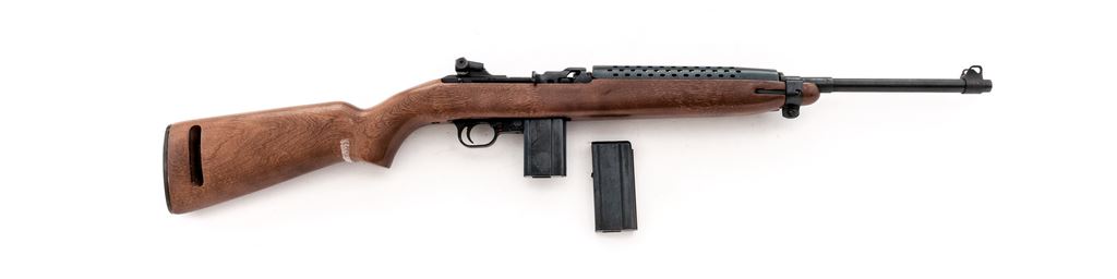 Universal M1 Semi-Automatic Carbine, #339600, .30 Carb. cal., 18'' barrel, blued finish, hardwood stock, blade front sight with protectors and sliding aperture rear sight, sling and oiler. Marked on chamber ''UNIVERSAL HIALEAH.FLA. CAL. 30 M1 PAT #3382.766''. Includes two (2) U.S.G.I. 15-rd. magazines marked ''IS'' and ''U''. Condition is near excellent, with approx. 90% finish remaining on the metal showing some patina and scratches on the barrel. Wood is close to excellent with a few handling marks at the toe of buttstock. Action is smooth, bright bore is very good. Est.: $500-$700. (Modern)(High-cap mags not available to Calif. residents.)