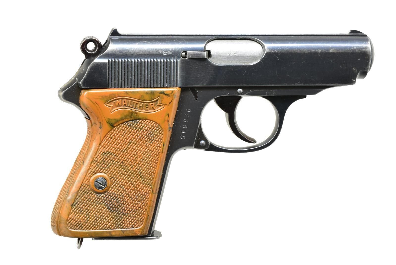 Cal. .22 LR. S# 928845. Standard configuration w/ extra milling inside & out to lighten slide. Crown “N” proof is at rear of extractor on polished bbl. housing & muzzle end of bbl. Walther markings are on left side along w/ 90 degree safety. Blued frame w/ S# that dates from 1935 has brown wraparound plastic grip. Special .22 cal. mag. is unmarked & has steel base. CONDITION: fine. Slide retaining over 80% original blue w/ holster wear at muzzle end, wear on high edges, blue thinning lightly overall. Front strap of grip somewhat silvered, high edge wear elsewhere. Grips are very fine, no noted cracks & some shrinkage. Mag. base silvered on edges. Bright, shiny bore. Mechanically fine. (20-3199/MGM). CURIO. $2,500-3,500.
