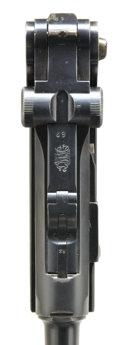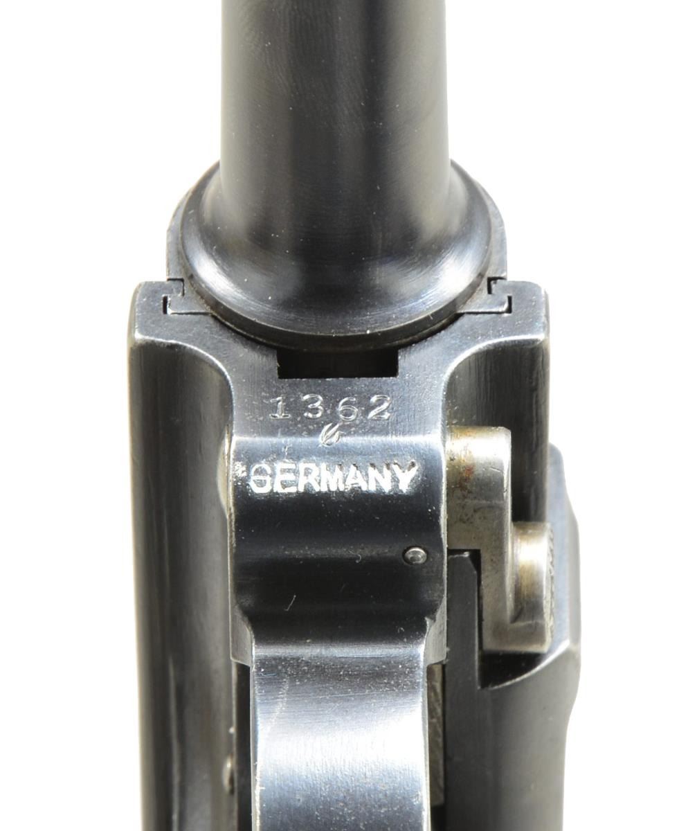 Cal. 30 Luger. S# 1362b. Bbl. 3 7/8”. Approx. 25,000 mfg. originally in 9mm Luger. Rebarreled to 30 Luger w/out markings on bbl. but w/ matching flats cut on top rear of bbl. & front of receiver; no matching chisel mark on bottom. Created for commercial foreign sales as indicated by “GERMANY” export mark under frame S#. Most metal parts including receiver matching numbered “62” in military positions. Firing pin numbered “80” plus left grip numbered “21”; right blank. Void of proofs. Appropriate strawed parts. MAGS: 1 good tin plated 8 rd. w/ plain wood base. Fails to function hold open latch; another mag. does. CONDITION: very good overall appearance w/ German quality refinish. 2 Faint impact marks on top of left receiver ear. Sm. chip on rim of rear toggle pivot. Good plus grips w/ light hand wear & some damaged diamond tops on left. Very light high point wear & near excellent bore. (20-3355/NW). CURIO. $800-1,200.
