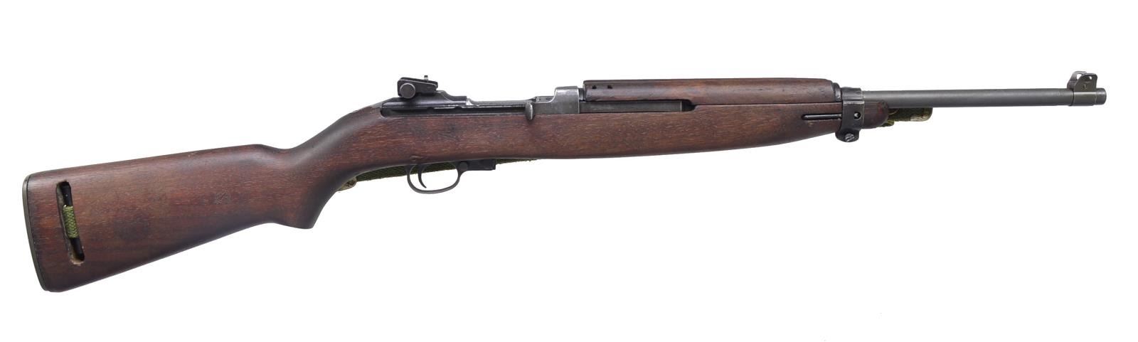 RIFLE. Cal. 30 Carb. S# 2106991. Bbl. 18" marked “INLAND MFG DIV. GENERAL MOTORS 6-43”. Stamped adj. aperture rear sight marked “H” in shield. Blade front sight w/ protective ears marked on left side “RIA”. Bbl. band w/ out bayonet lug marked “SI”. Straight cut slide marked “PI”. Flat bolt marked “4IS”. Milled trigger guard marked “SG”. Smooth, push button safety. Mag. catch marked “CC”. Dog leg hammer. Low wood oval cut walnut stock marked on right side w/ crossed cannons & under pistol grip w/ “P”. 4-Rivet handguard marked “IO”. Green web sling. CONDITION: stock has arsenal rework finish w/ light wear, handling marks, staining & sm. scratches. Notable sm. gouge on right side over trigger guard. Receiver has arsenal rework parkerization. Bbl. retains lg. degree of original wartime parkerization. Bolt has turned gray w/ light oxidation & spots of pitting. Very good, shiny bore. (20-2518/RW). CURIO. $400-600.