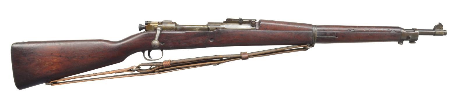 RIFLE. Cal. 30-06. S# 1151658. Action is welded on left side of rear ring through bolt release area. Action screws & floorplate latch are welded solid. Bore is nearly full length plugged. Bolt opens & closes & fires as normal. Bbl. 24" marked "SA / flaming bomb / 12-19". Blade front sight w/ graduated leaf rear sight. Skant style stock w/ walnut forearm. Left side of stock has "SA / GAW" rework mark along w/ crossed cannons acceptance mark. Leather military sling on original swivels. CONDITION: 50% dull fading parkerized finish. Stock has dark appearance showing scattered dents & marks. (20-2516/DS). CURIO. $200-400.