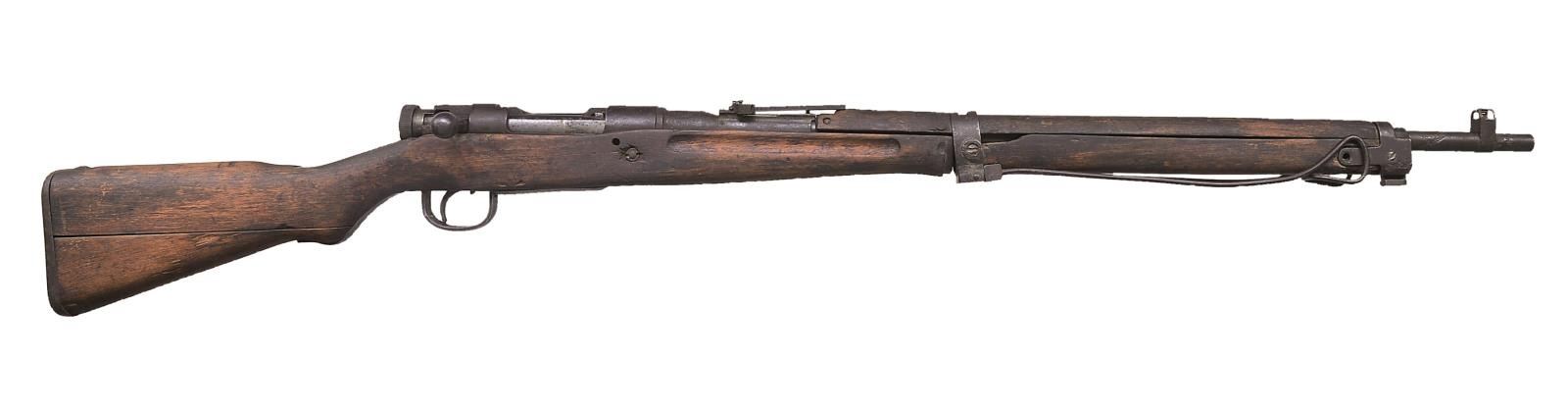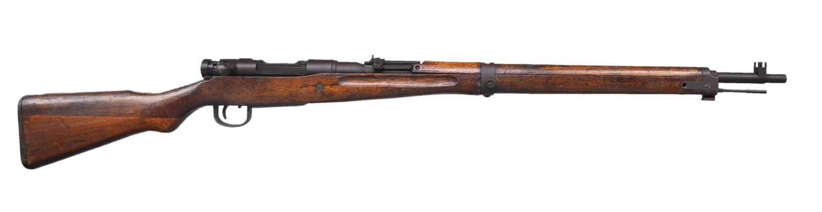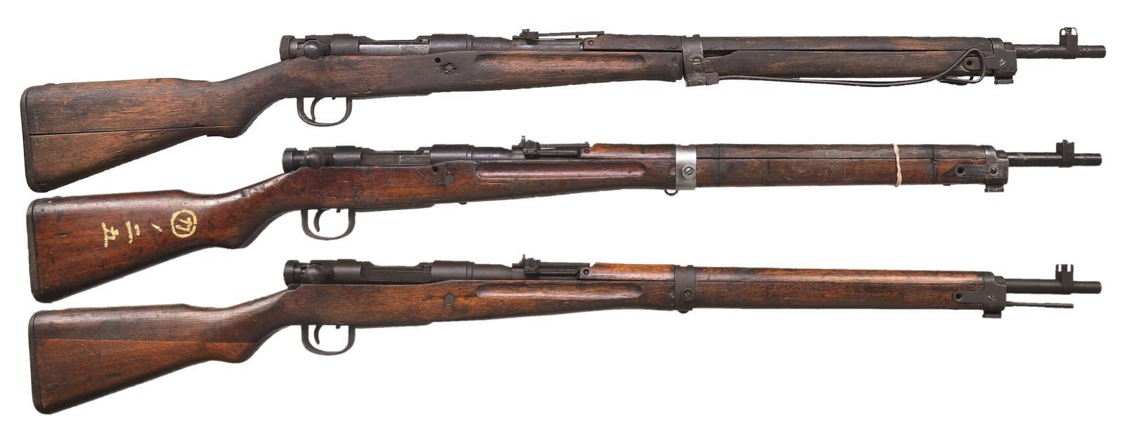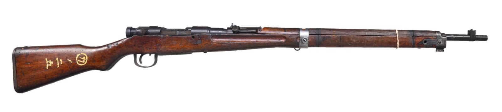 1) NAGOYA T99. Cal. 7.7 Jap. S# 16864. Bbl. 25 1/2". Receiver marked on left rail w/ Nagoya Arsenal marking. Mum is obscured from pitting on metal surface. Type 99 characters are legible. Has Type 38 ladder rear sight, graduated to 2400m. Inverted V front sight w/ protective ears. Oval bolt knob. Large tang checkered safety notch. Cleaning rod is not present. 3-Screw upper band. Rear screws are not present. Has mono pod. Sm. diameter recoil bolt. 2-Screw rear swivel, swivel ball is not present. Cup type buttplate. Rear trigger guard tang screw not present. Hard wood stock set. Forend has duffel cut underneath lower band. CONDITION: stock set has extensive wear w/ dark staining, dents & scratches throughout. Stock has scorched appearance. Large chip is missing from forend on right side near lower band. Buttstock dovetail is notably open. Metal has turned overall gray & patina w/ extensive pitting throughout all surfaces. Front sight protective ears are bent inwards. Fair worn dark bore. (20-2962/RW). 2) NAGOYA TYPE 99. Cal. 7.7 Jap. S# 90400. Bbl. 25 1/2". Receiver marked on left rail w/ Nagoya Arsenal marking. Mum has been removed leaving Type 99 characters. All visible numbers match. Ladder aperture rear sight w/ anti-aircraft wings graduated to 1500m. Rear sight slide retaining screw is not present. Inverted V front sight w/ protective ears. Oval bolt knob. Checkered notched safety knob. Cleaning rod is present but does not come free of stock. 2-Screw upper band, rear screw is not present. Lower band does not have provision for mono pod. Sm. recoil bolt. Front & rear trigger guard screws are not present. Trigger guard retained by tang screw. Butt swivel is not present. Cup type buttplate. Hard wood stock set. CONDITION: stock set has moderate wear, dents, staining & scratches throughout. Metal has traces of blue turning patina w/ light oxidation & scattered fine pitting throughout. Very good shiny bore. (20-2964/RW). 3) KOKURA ARSENAL. Cal. 7.7 Jap. S# 1337. Bbl. 25 1/2". Receiver marked on left side w/ Kokura Arsenal marking. Mum has been removed. Type 99 characters are present. Has ladder aperture rear sight w/ anti-aircraft wings. Rear sight base retaining screws are not present. Inverted V front sight, protective ears have been removed. Oval bolt knob & checkered notched safety knob. Firing pin is not present, leaving firing pin spring in place. Alignment stop on safety knob has been removed. Cleaning rod is not present. 3-Screw upper band, rear screws are not present. Replacement lower band is in the white w/out provision for mono pod. Sm. reinforcing bolt. 2-Screw butt swivel. Cup type buttplate. Hard wood stock set. Buttstock marked on left side w/ oriental characters in white. CONDITION: stock set has extensive wear, dents, scratches & staining. Notable missing chip at left side of receiver. Forend has 2 repaired duffel cuts between bbl. bands. Forward end of forend, on right side, is separated. Metal has traces of blue turning gray & patina w/ wear, scratches, oxidation & light pitting. Screw slots are distorted. Front guard screw threads do not engage. Very good shiny bore. (20-2966/RW). ALL CURIO. $300-500.