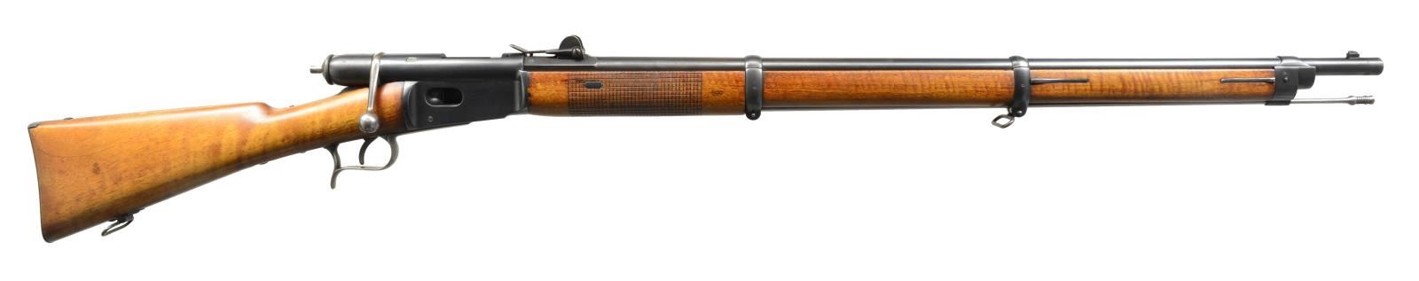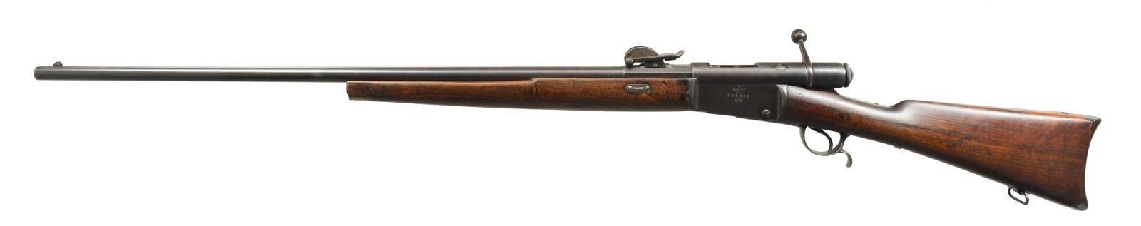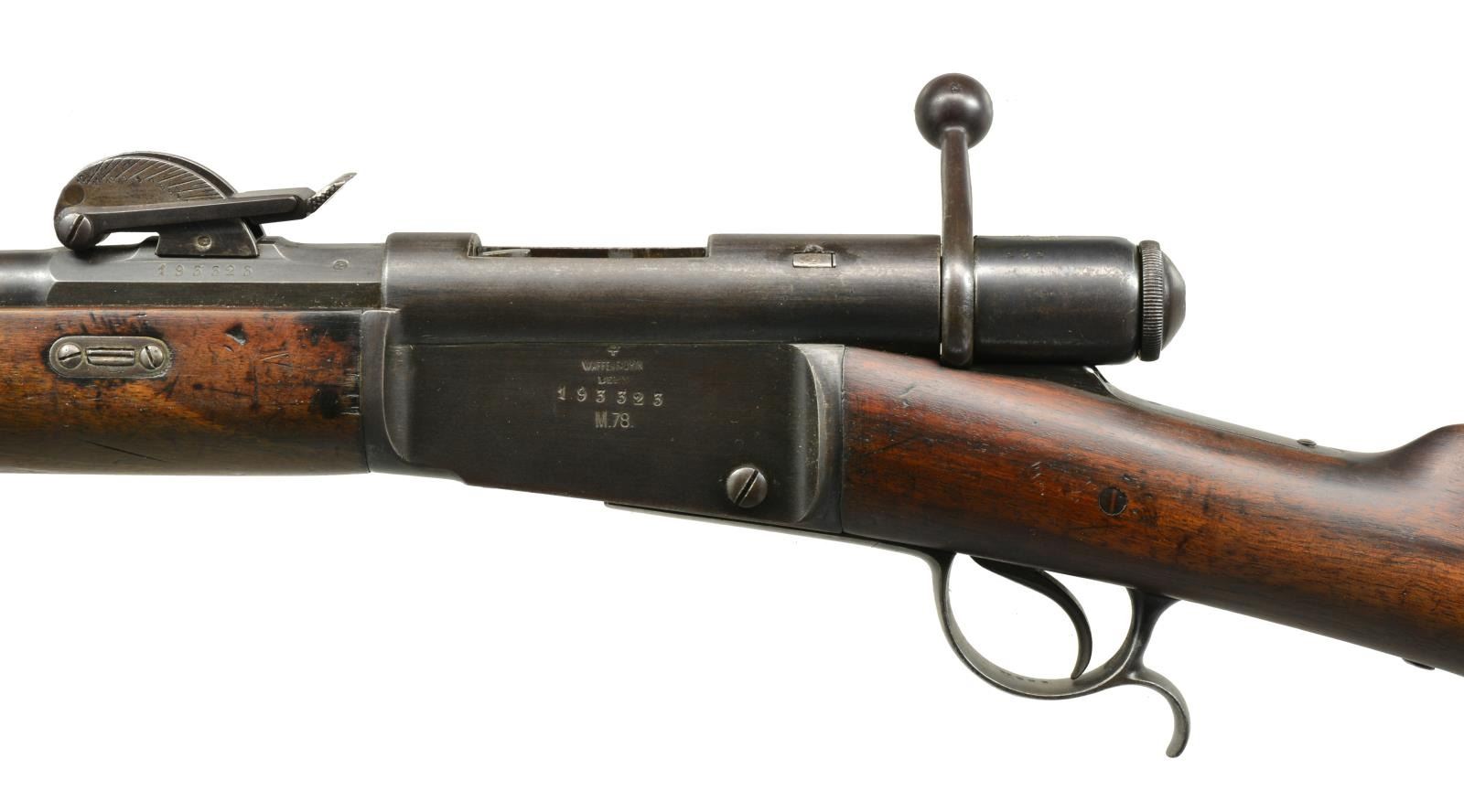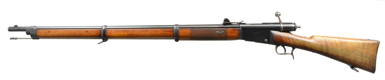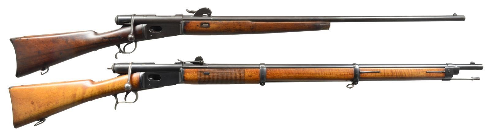 1) SPORTERIZED MODEL 78 VETTERLI RIFLE. Cal. 10.4x38 (41 Swiss Rimfire). S# 193323. Bbl. 33". Receiver marked on left side “M.78” then “WAFFENFABRIK BERN”. All visible numbers match. Tangent rear sight graduated to 1200 schritt. Blade front sight. Rifle has been sporterized by removal of bbl. bands, shortening mag. tube & forend approx. 16 1/2" ahead of receiver. CONDITION: stock set has been refinished w/ wear, dents, staining & scratches throughout. Forend had wood removed on the finial approx. 9" of the bbl. channel. Buttstock has notable gouge on right side of grip. Metal has traces of blue turning overall gray & patina w/ light oxidation & very fine pitting throughout. Bore is turning dark w/ scattered, moderate pitting & sharp lands. (01-18070/RW). 2) MODEL 1871 INFANTRY RIFLE. Cal. 10.4x38 (41 Swiss Rimfire). S# 81373. Bbl. 33". Numbers match on receiver, bbl., follower & buttplate. Fine example of the Model 71 rifle which replaced the Model 1869 w/ several improvements. Receiver marked on left side “SOC. IND. SUISSE SYST. VETTERLIN”. Rear sight is earlier type graduated to 1000 schritt. Blade front sight. Cleaning rod is present. Bottom swivels. Walnut stock set. Forend has crosshatched type checkering. Forend & buttstock marked on right side w/ “V” in shield acceptance marks. Buttstock marked on top w/ boxed “D6”, Swiss cross & “CI”. CONDITION: stock set has light wear & handling marks, showing careful use. Metal has 85% original blue finish w/ thinning & light wear. Very good, shiny bore w/ sharp rifling. (01-18078/RW). BOTH ANTIQUE. $700-900.