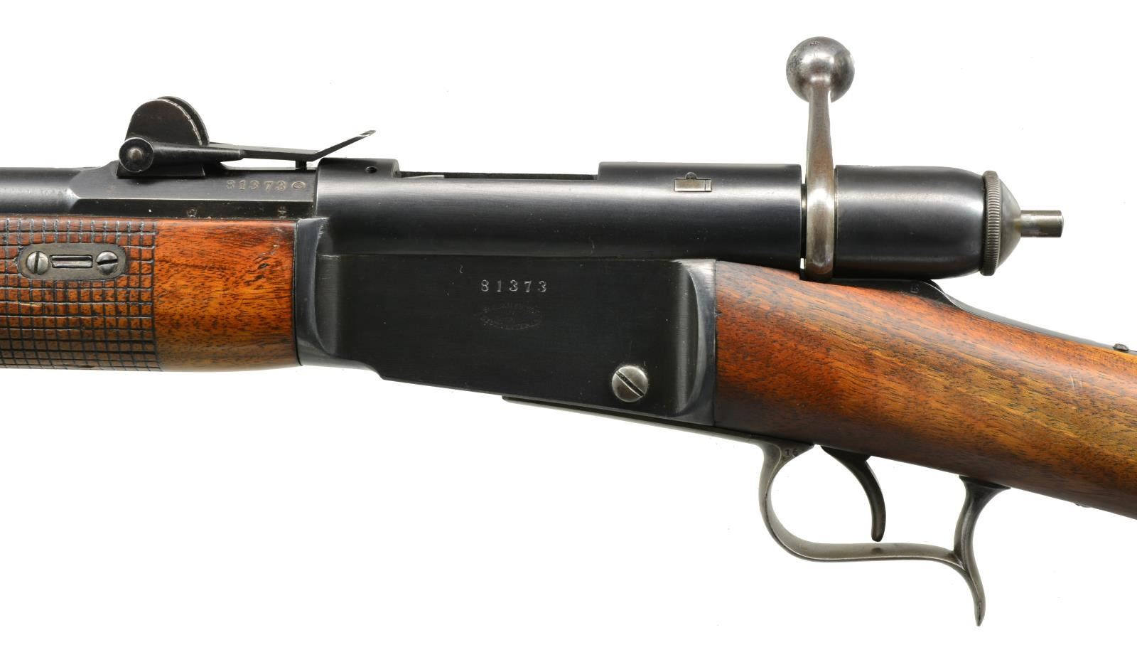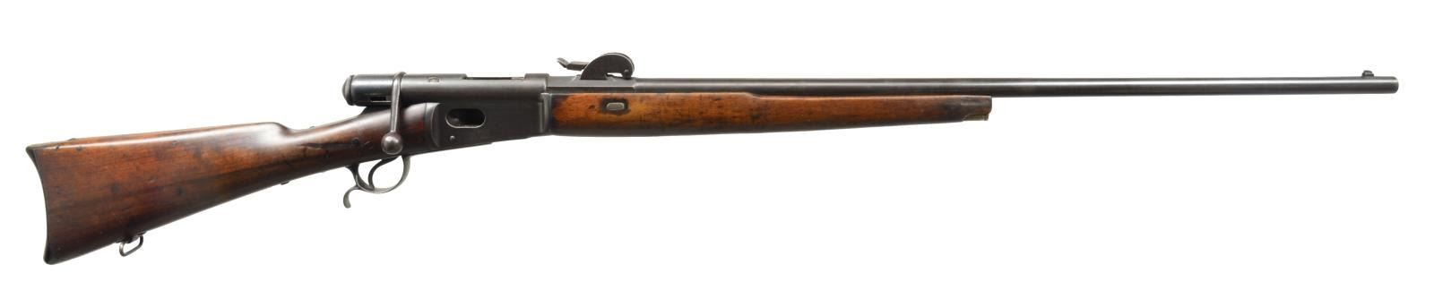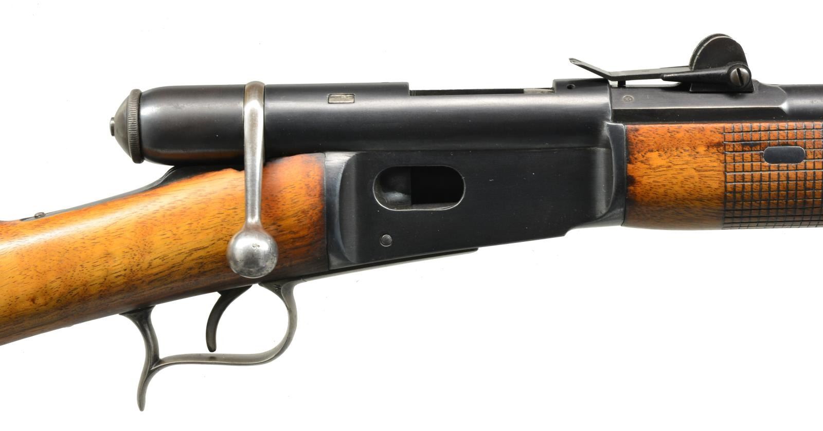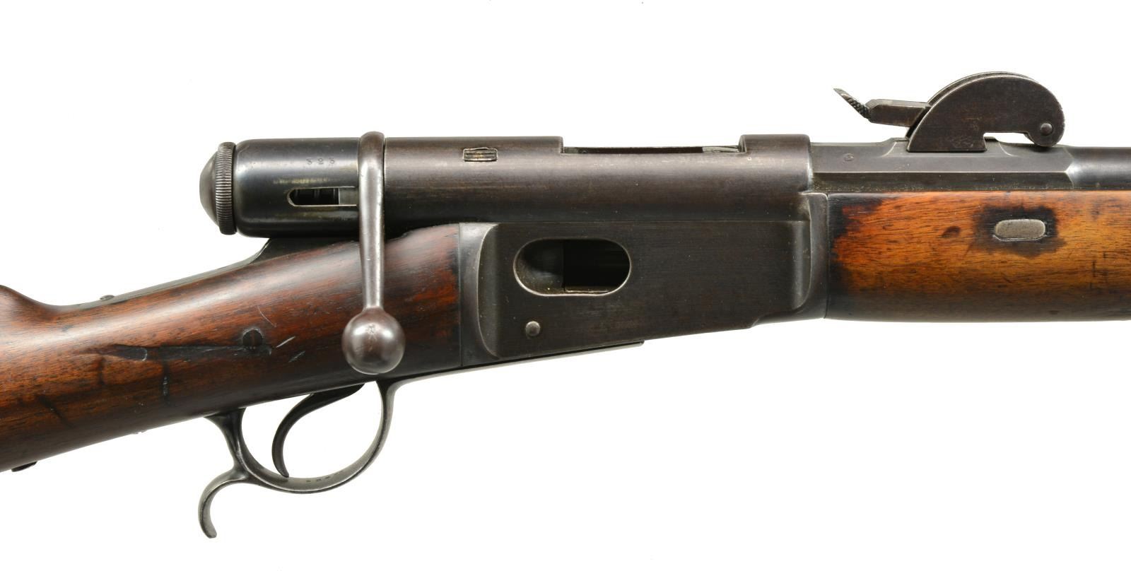 1) SPORTERIZED MODEL 78 VETTERLI RIFLE. Cal. 10.4x38 (41 Swiss Rimfire). S# 193323. Bbl. 33". Receiver marked on left side “M.78” then “WAFFENFABRIK BERN”. All visible numbers match. Tangent rear sight graduated to 1200 schritt. Blade front sight. Rifle has been sporterized by removal of bbl. bands, shortening mag. tube & forend approx. 16 1/2" ahead of receiver. CONDITION: stock set has been refinished w/ wear, dents, staining & scratches throughout. Forend had wood removed on the finial approx. 9" of the bbl. channel. Buttstock has notable gouge on right side of grip. Metal has traces of blue turning overall gray & patina w/ light oxidation & very fine pitting throughout. Bore is turning dark w/ scattered, moderate pitting & sharp lands. (01-18070/RW). 2) MODEL 1871 INFANTRY RIFLE. Cal. 10.4x38 (41 Swiss Rimfire). S# 81373. Bbl. 33". Numbers match on receiver, bbl., follower & buttplate. Fine example of the Model 71 rifle which replaced the Model 1869 w/ several improvements. Receiver marked on left side “SOC. IND. SUISSE SYST. VETTERLIN”. Rear sight is earlier type graduated to 1000 schritt. Blade front sight. Cleaning rod is present. Bottom swivels. Walnut stock set. Forend has crosshatched type checkering. Forend & buttstock marked on right side w/ “V” in shield acceptance marks. Buttstock marked on top w/ boxed “D6”, Swiss cross & “CI”. CONDITION: stock set has light wear & handling marks, showing careful use. Metal has 85% original blue finish w/ thinning & light wear. Very good, shiny bore w/ sharp rifling. (01-18078/RW). BOTH ANTIQUE. $700-900.