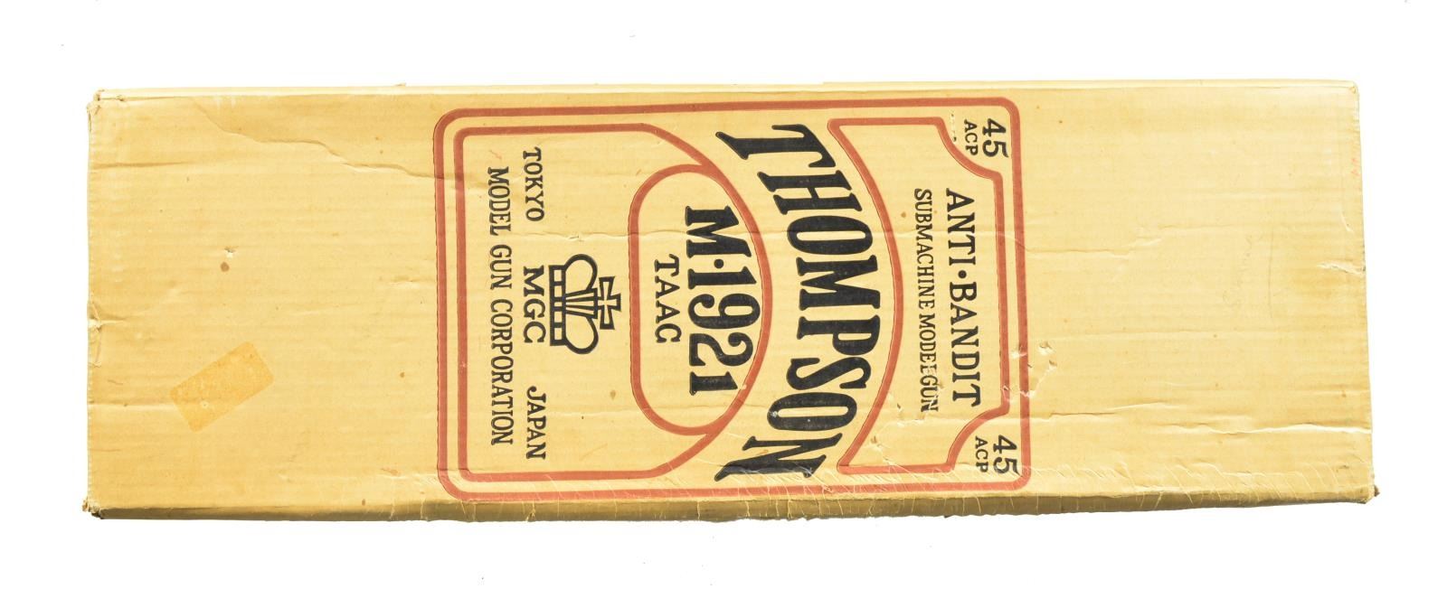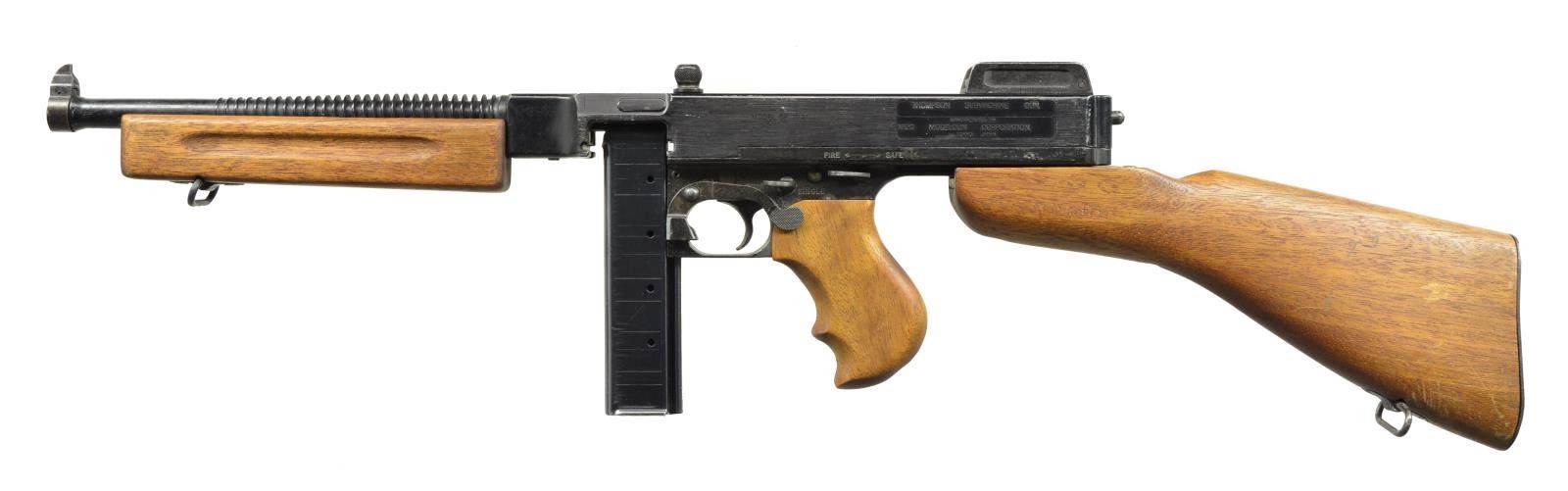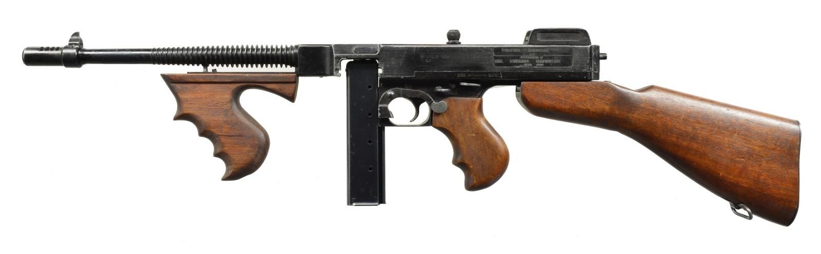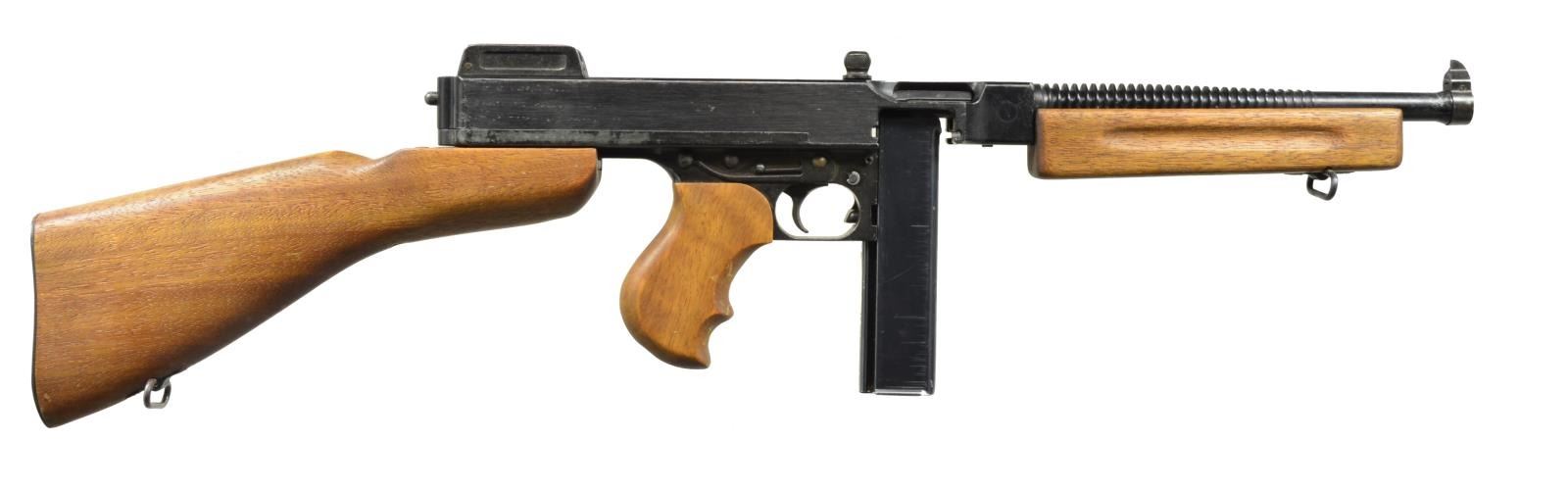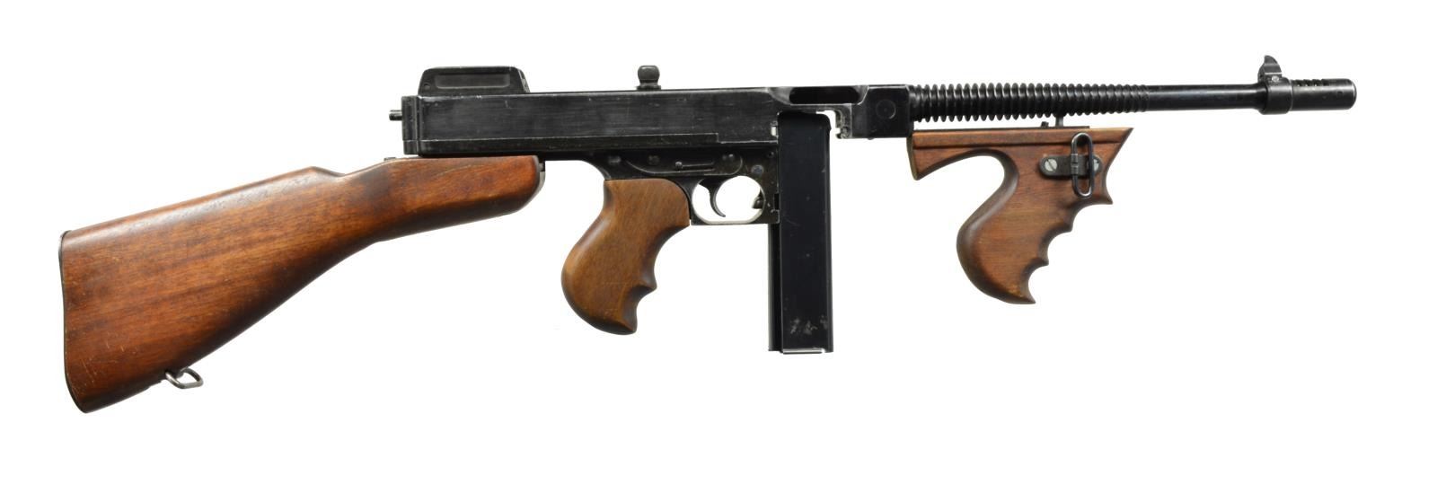 2 Loose examples of the iconic Thompson SM, representing the 1921 & the M1. High quality reproductions mfg. by Replica Models Inc. of Alexandria, VA are even accompanied by the 1971 letter on Department of the Treasury letter head declaring them nonguns & therefore legal to import from Modelgun Corp. in Tokyo, Japan. Weighing in at approx. 9 lbs. w/ an overall length of over 33", that even when handled, give a feeling of authenticity. Both have finned bbls. & wood furniture w/ removable stocks by pushing a button. The 1 more closely resembling the 1921 has a vertical fore grip & a Cutts style compensator front sight, while the 1 mostly resembling the M1 has a horizontal forend w/ out the compensator. Both have markings replicating the full autos, including a functioning safety & selector. MAGS: 2, each gun has a designated 20 rd. stick mag. that may or may not be functional. UNATTACHED ACCESSORIES: 2 determination letters dated March 26, 1971 from Department of Treasury. 1 Original shipping box. CONDITION: while the outward appearance reflects positively on these prop guns, any serious Thompson aficionado will find plenty of faults. These are certainly not reflective of early Colt Thompsons by any means. The bolts lock open simulating an open bolt firing mechanism. Mags. are removable. Everything appears to function correctly, though these are definitely unable to be used w/ any type of ammunition. Wood is decent & appears period correct w/ out any obvious structural flaw. (02-13778/JZ). NONGUN. $400-800.