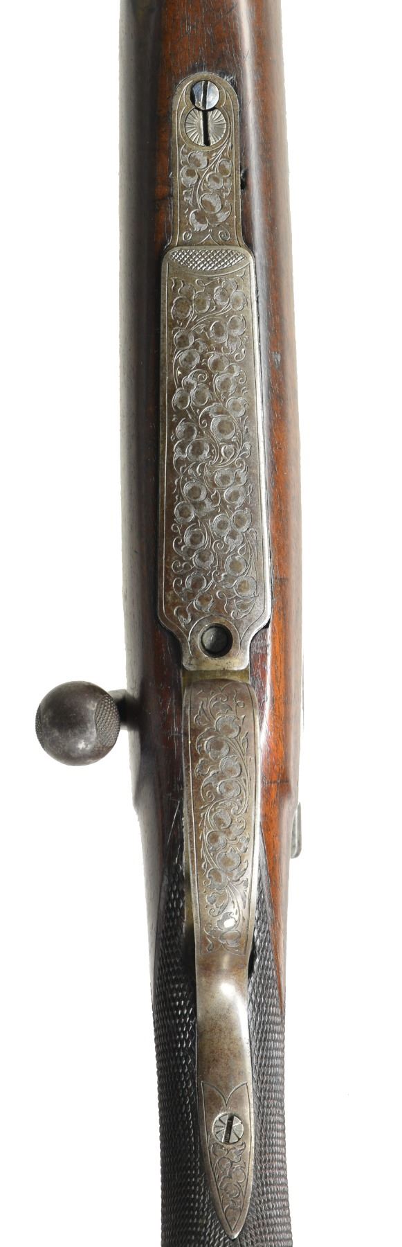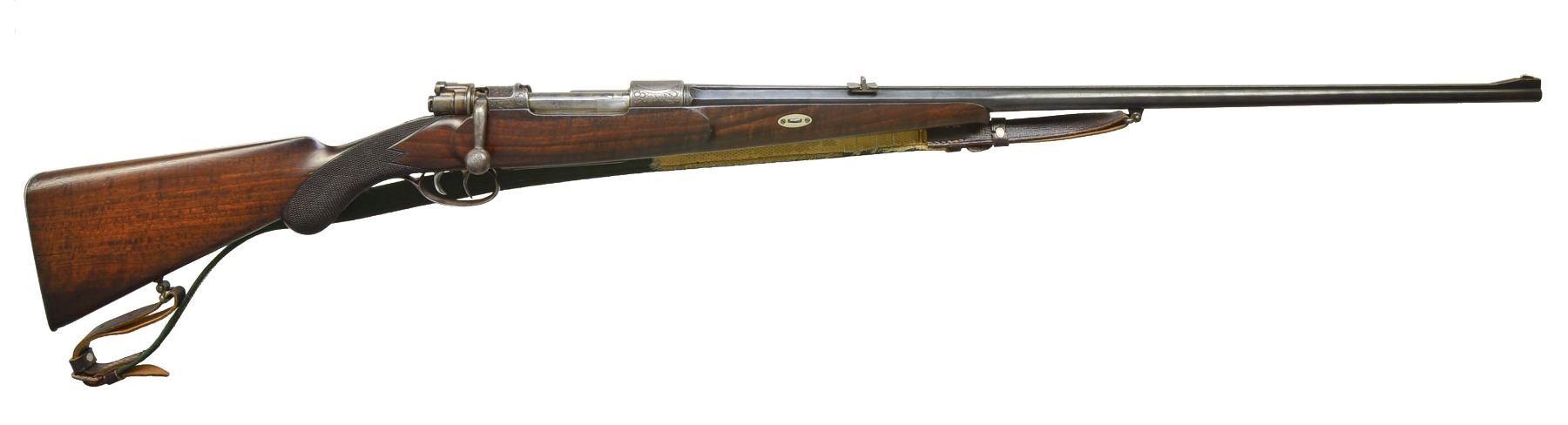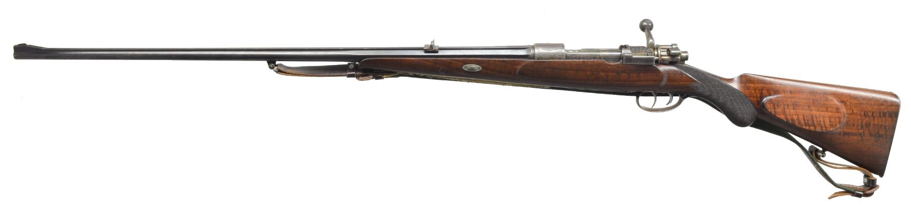EMIL BARTSCH OF SUHL. Cal. 8x57 J (.318 bore). NSN. This nicely finished pre WWI rifle has 30 1/2" 1/3 oct. bbl. w/ full length integral matted rib. A 1 standing, 2 folding leaf rear sight & silver bead front are fitted. Maker’s name & address inlaid are in silver in milled out portion on top of rib toward rear. Lg. ring model 98 action is stamped w/ pre WWI German nitro proofs. Action is case hardened & engraved w/ 90% coverage well cut scrolling acanthus. Bolt knob is checkered in 2 panels. Dbl. set triggers & shotgun type trigger guard are installed. Nicely fiddle figured European walnut stock measures 14" over steel buttplate & features sm. right hand cheekpiece, early style reinforced action area, sm. schnabled tip & well cut point pattern checkering at grip. A secondary side bolt is fitted through forend of stock. Rifle is fitted w/ old canvas & leather sling in original loops. CONDITION: very good, mostly original. Bbl. retaining most of its blue w/ some scattered flecking & silvering on sharp edges. Action & bolt have most of their original case hardening color. There are numerous marks, both light & fairly deep in oil finish of stock. Checkering lightly worn. Bore is good, strong rifling, a bit dark but needs cleaning. Mechanically good. Trigger guard tang screw replaced.(20-3095/MGM101). CURIO. $1,100-1,800.