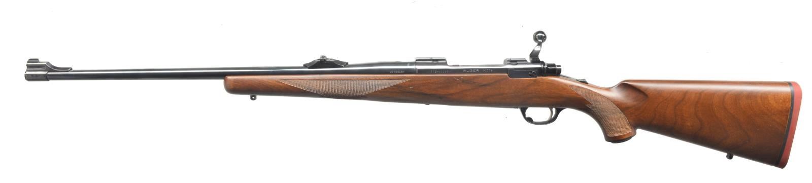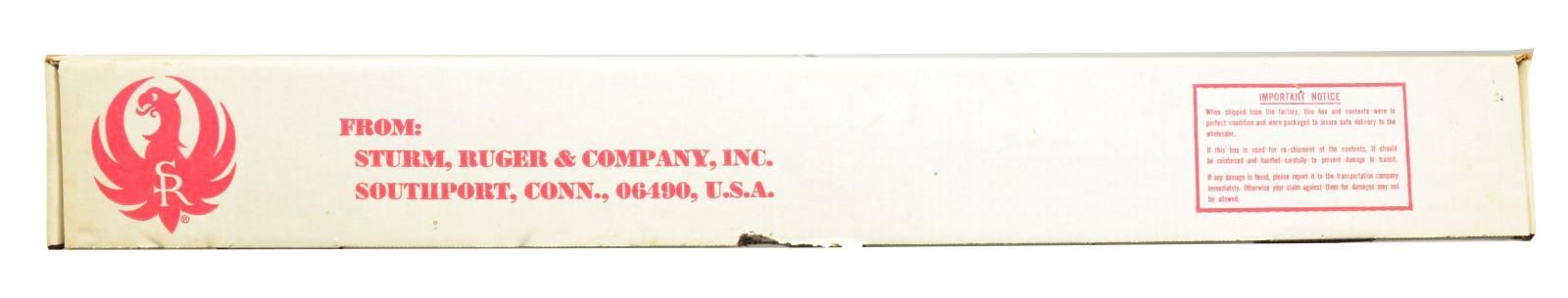 Cal. 35 Whelen. S# 772-43190. Bbl. 22” rnd. Banded ramp front w/ peep sight & screw on island rear w/ flip up adj. sight. Mfg. 1989 (1989-1992; 1912 units). Receiver cut for Ruger rings, not included. Rnd. bolt w/ tang safety. Checkered stock & checkered pistol grip. Black grip cap w/ Ruger emblem. Red Ruger recoil pad. Sling swivel studs installed. Bolt has etched matching number. UNATTACHED ACCESSORIES: original box & paperwork. CONDITION: bbl. retains most of its original blue w/ a minor scratch near muzzle. Receiver retains most of its original blue w/ minor thinning on edges. Trigger guard & floorplate retain its original finish. Stock has original finish w/ a few handling marks. Good checkering. Gun appears nearly unfired. Bore is bright. (20-4181/BT). MODERN. $600-900.