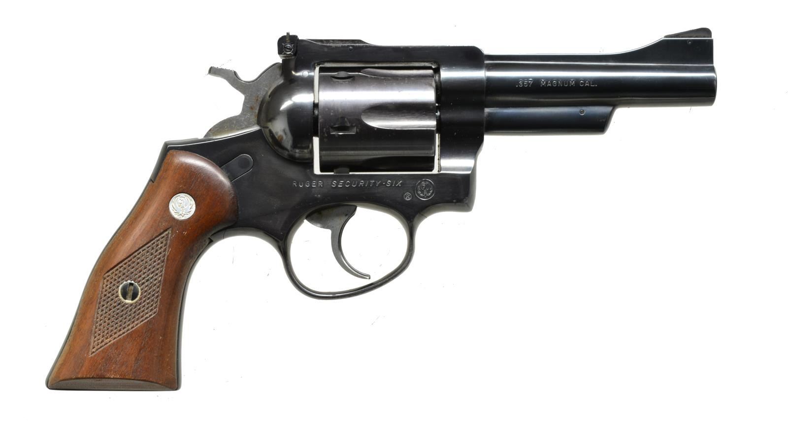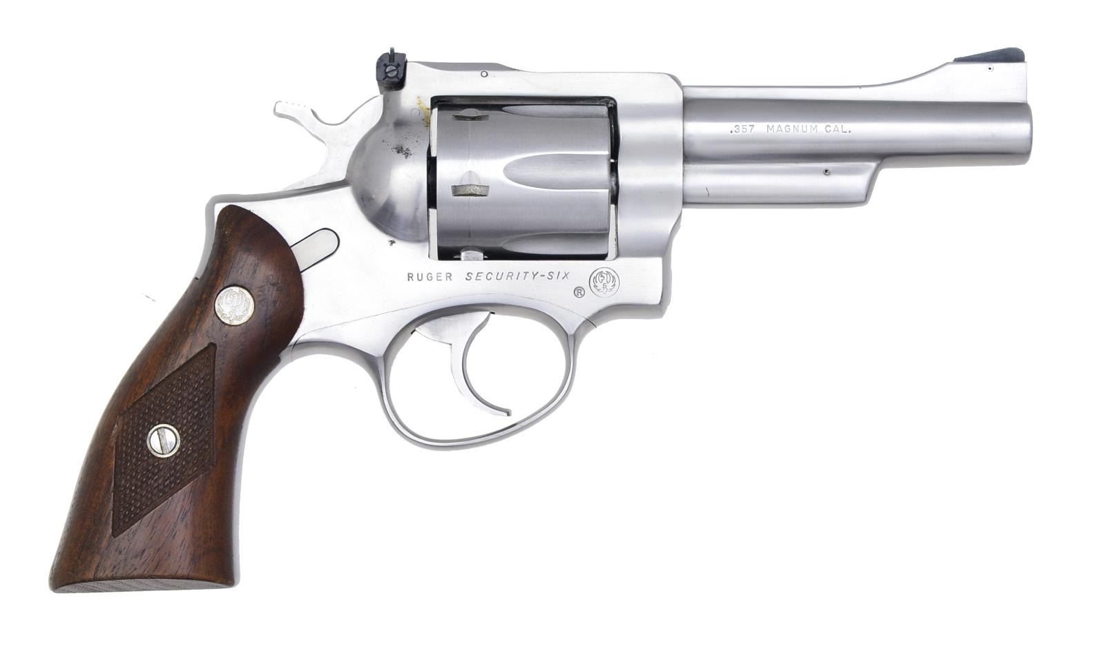 1) BLUED 4" STAINLESS STEEL SECURITY SIX. Cal. 357 Mag. S# 151-43400. Bbl. 4" stainless steel bbl. w/ serrated rib & pin blade front sight. Adj. rear sight. Checkered Ruger walnut grips. 6 Shot cyl. UNATTACHED ACCESSORIES: red & black Ruger box Cat. No. RDA-34 w/ papers. Box marked w/ non matching pen written number. CONDITION: original stainless finish w/ minor turn ring on cyl. Grips have original finish w/ good checkering. Bore is very good. (20-3646/BT). 2) BLUED 4" SECURITY SIX. Cal. 357 Mag. S# 150-37276. Bbl. 4" serrated solid rib bbl. Pin blade front sight & adj. rear sight. 6 Shot cyl. Checkered Ruger walnut grips. CONDITION: gun retains most of its original blue w/ some minor muzzle wear. Grips have very good original finish w/ good checkering. Bore is bright. (20-3650/BT). BOTH MODERN. $500-800.