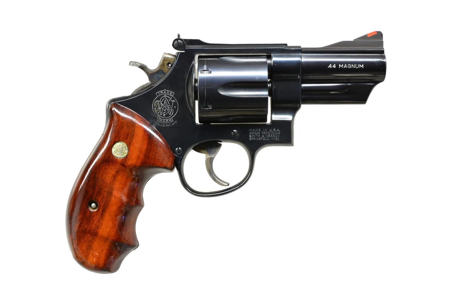 Cal. 44 Mag. S# ALB5341. Bbl. 3" w/ rib & fully shrouded ejector. Red serrated ramp front sight w/ white outline square notch adj. rear sight. 6 Shot fluted cyl. N frame 3 screw action w/ blue finish. Case colored hammer & trigger. Bbl. & action markings have white highlighter. 2 Piece Goncalo Alves rnd. butt combat grips w/ S&W medallions. CONDITION: over 98% metal finish showing a cyl. drag line. Grips show light handling marks. Bright near excellent bore. (20-3663/DS). MODERN. $600-900.