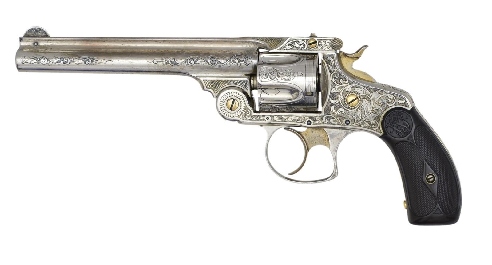 REVOLVER. Cal. 38 S&W. S# 283931. Bbl. 5" rnd. w/ rib & semicircular sight. 5 Shot fluted cyl. Top break action. Frame including back strap & trigger guard, cyl., & bbl. including front sight having 75% coverage of finely executed hand engraving. Engraving consist of vine type foliate scroll w/ cross hatch highlights & punch dot backgrounds. Full nickel finish w/ gold finished hammer, trigger, top latch & action screws. 2 Piece checkered hard rubber grips. Butt of gun is marked 2 stars indicating factory rework. Mfg. 1884-1895. CONDITION: bbl., action & cyl. retain over 95% nickel finish showing spots of flaking & freckling. Gold finished parts have worn & thinning finish. Grips show moderate wear w/ sm. cracks at bottom of right panel. Sound mechanics. Lightly pitted bore w/ intact rifling. (01-18687/DS). ANTIQUE. $900-1,500.