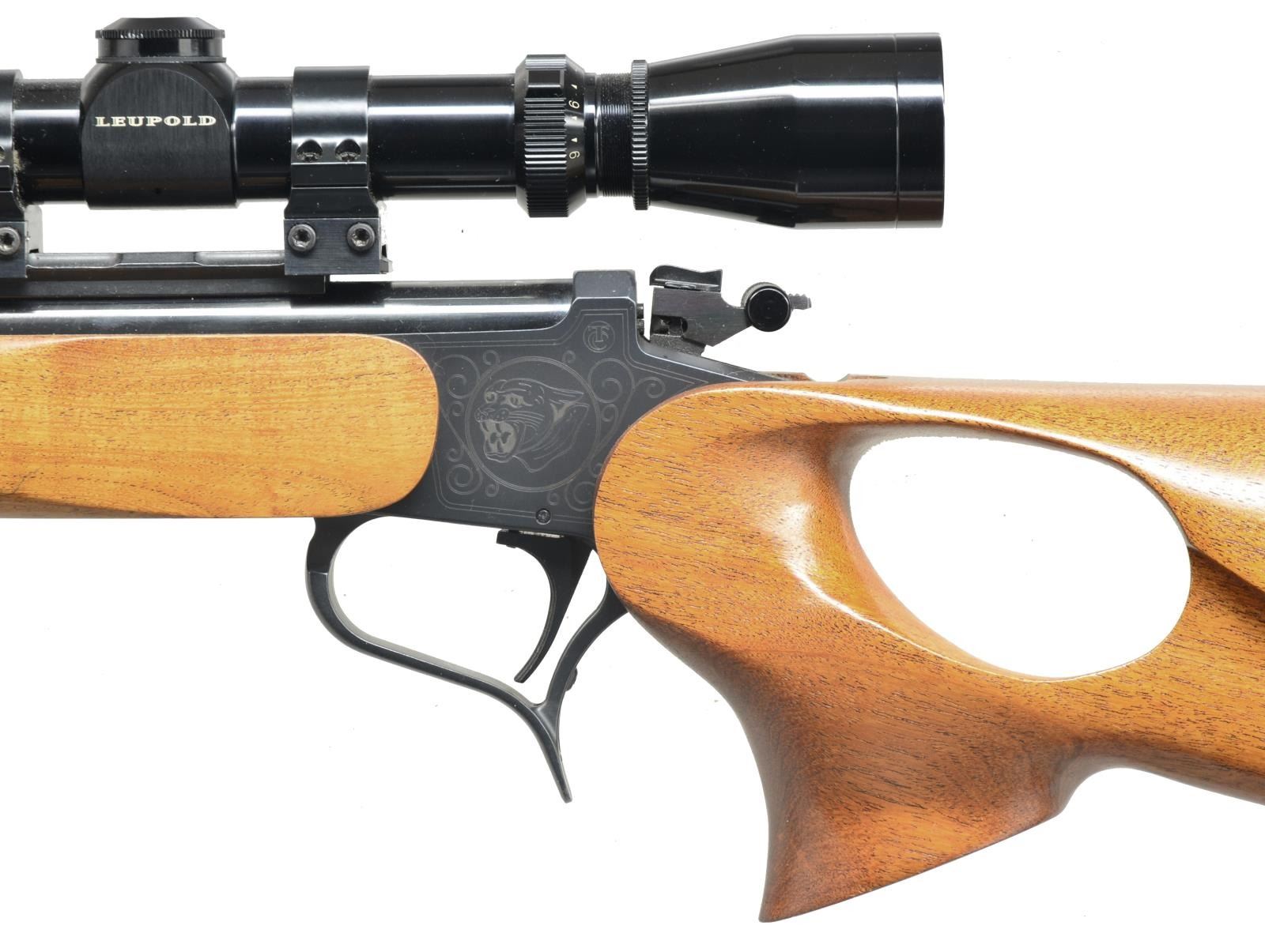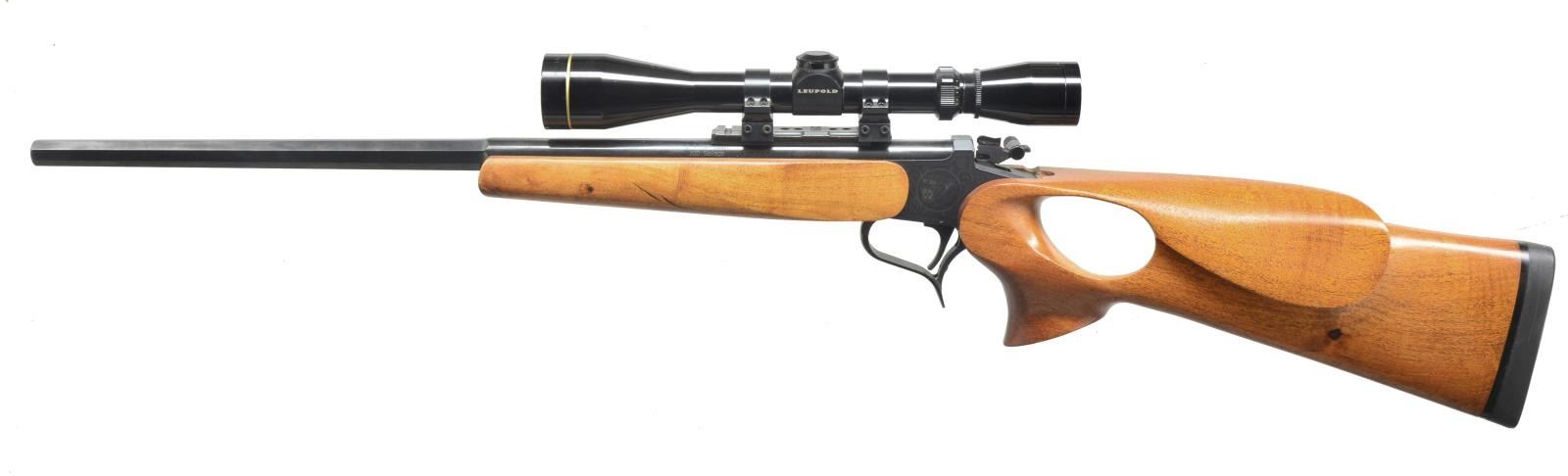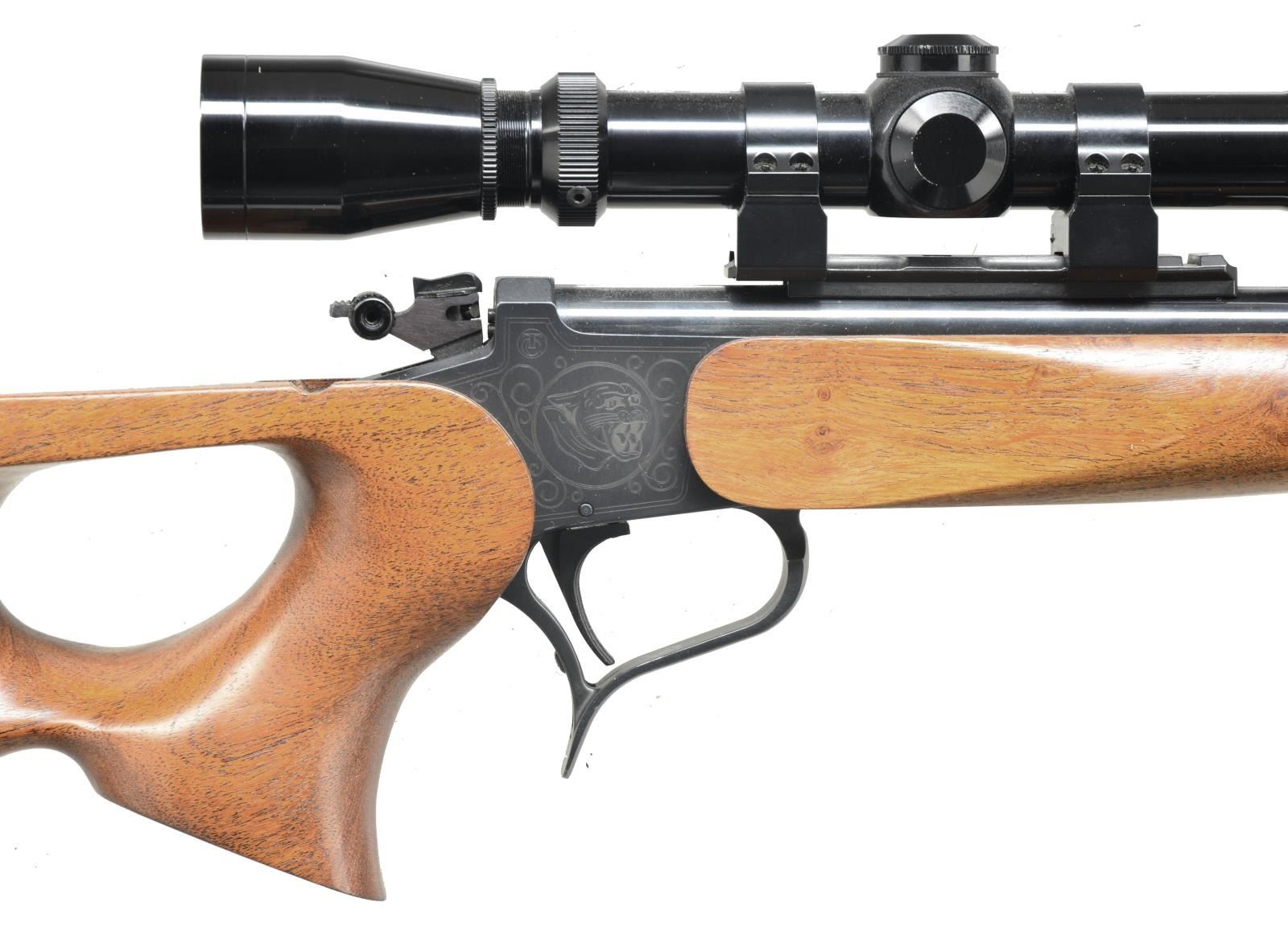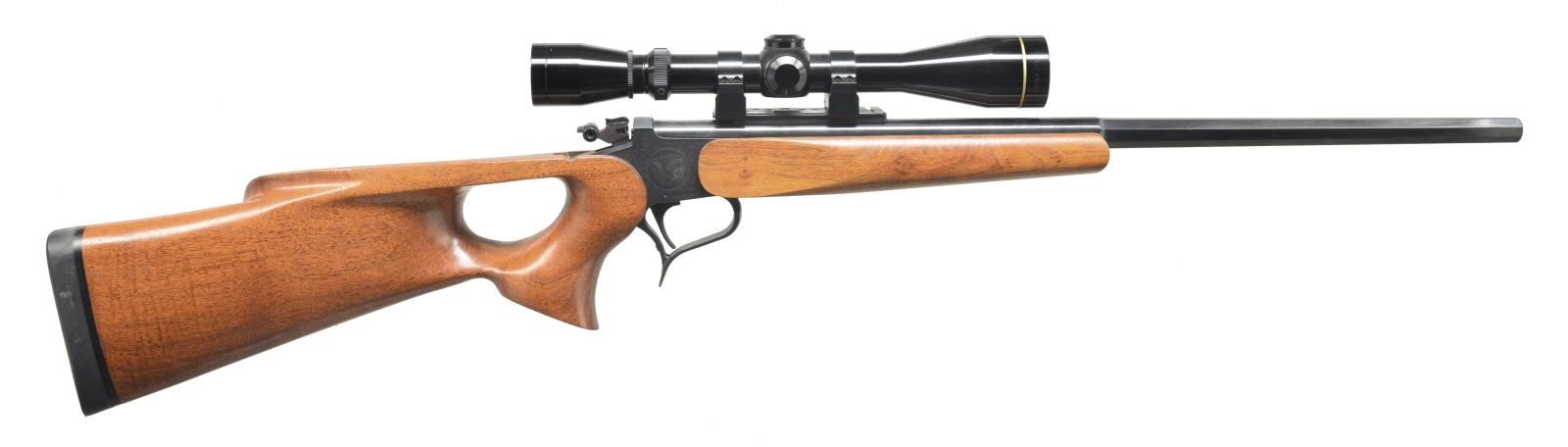 WITH SCOPE. Cal. 300 Savage. S# 458251. Bbl. 22" half rnd, half octagon. Bbl. is marked "D.A. VAN HORN" and cal. (300 Savage) on left side. Bbl. is fitted w/ Weaver type scope base. Standard Contender action engraved w/ scrolls surrounding snarling pumas has thumb extension fitted to hammer. Custom American walnut thumb hole buttstock measures 15" over black "Decelerator" pad & features right hand rollover comb & cheekpiece. Matching beavertail forend attaches to bbl. w/ 2 screws. Rifle is fitted w/ Leupold VX-II 3-9x scope w/ duplex reticle in alloy Weaver rings. Weight: 7 lbs. 5 oz. CONDITION: very fine. Appears to be close to "as new" w/ only a few minor handling & assembly marks in all finishes. Scope is also very fine. Optically clear (20-3569/MGM). MODERN. $600-1,000.
