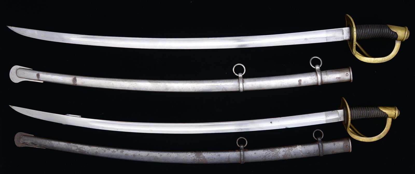 1) UNMARKED S&K TYPE 1 SABER. 36.25” Blade w/ faked “COLUMBIA, SC” stamped on ricasso & fake inspector initials on pommel. CONDITION: very fine overall, blade is lustrous retaining most original polish, grip retains 95% plus original other w/ complete type twisted wire. Import scabbard is gray w/ scattered staining & pitting. Hilt & pommel have light to medium mustard patina. (02-14673/JS). 2) “HORSTMANN / & SONS / PHILADELPHIA” stamped 36” blade. CONDITION: very good overall, blade retains most of its original polish & luster, minor staining & pinprick pitting. Grip retains complete leather grip & twisted wire wrap. Scabbard is sound, iron patina. Hilt & pommel have a medium mustard patina, appears re-peened. (02-14674/JS). $2,000-3,000.