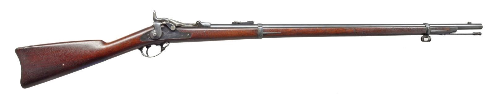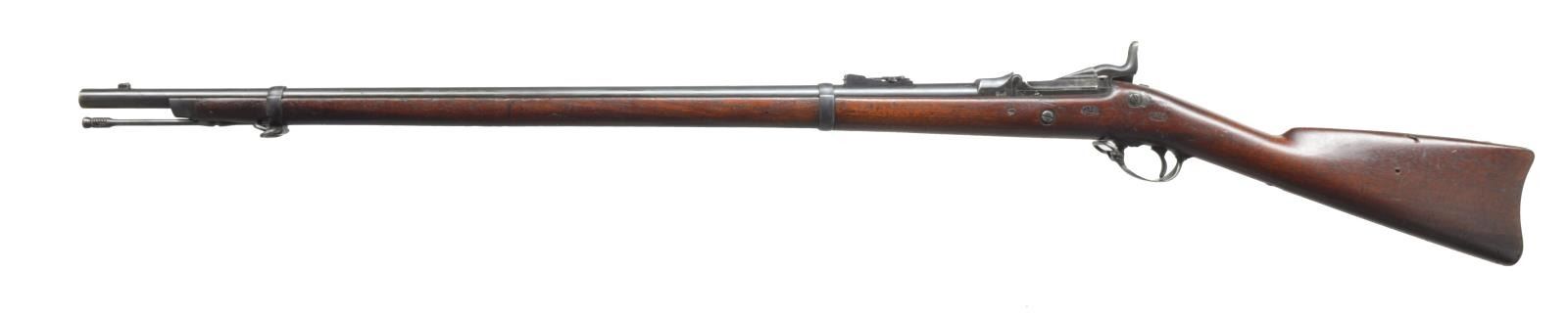 Cal. 45-70. S# 58162. Bbl. 32" V/P/Eagle w/ graduated rear sight. 1873 High hump breech block. 2 Click hammer. NJ marked left side of stock & receiver. Erskine Allen inspector mark. CONDITION: overall very nice looking w/ strong blueing that is fading on the block & hammer area. Very nice stock w/ very nice markings, however there are a few moderate spaced heavier gouges & more peculiarly a single steel shot pellet embedded in the right but of the stock & what appears to be where two others struck the left side of the comb. Bright bore w/ great rifling. (01-18667/ZAL). ANTIQUE. $400-600.