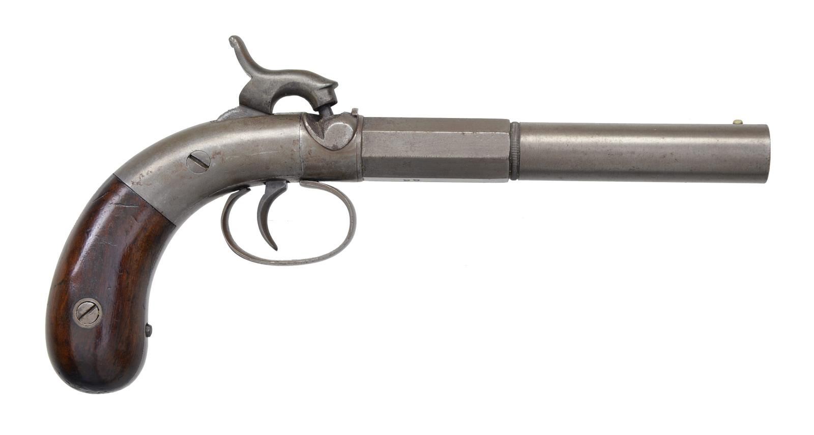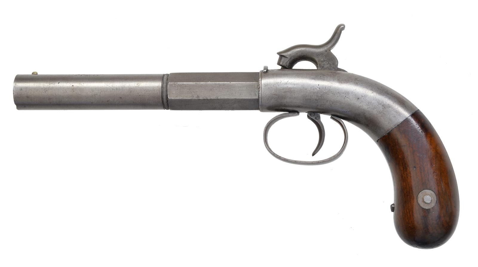 SINGLESHOT PERCUSSION PISTOL. Cal. 36. S# 29. Bbl. 5" oct. to rnd. bbl. marked “ALLEN & WHEELOCK”. CONDITION: very good, traces of finish, crisp markings, light pitting at breech. Metal overall gray patina, grips refinished & varnished. Mechanically will not hold on full cock, crisp discernable rifled bore. PROVENANCE: Lifelong collection of early Allen pistols. (01-18572/JS). ANTIQUE. $300-400.