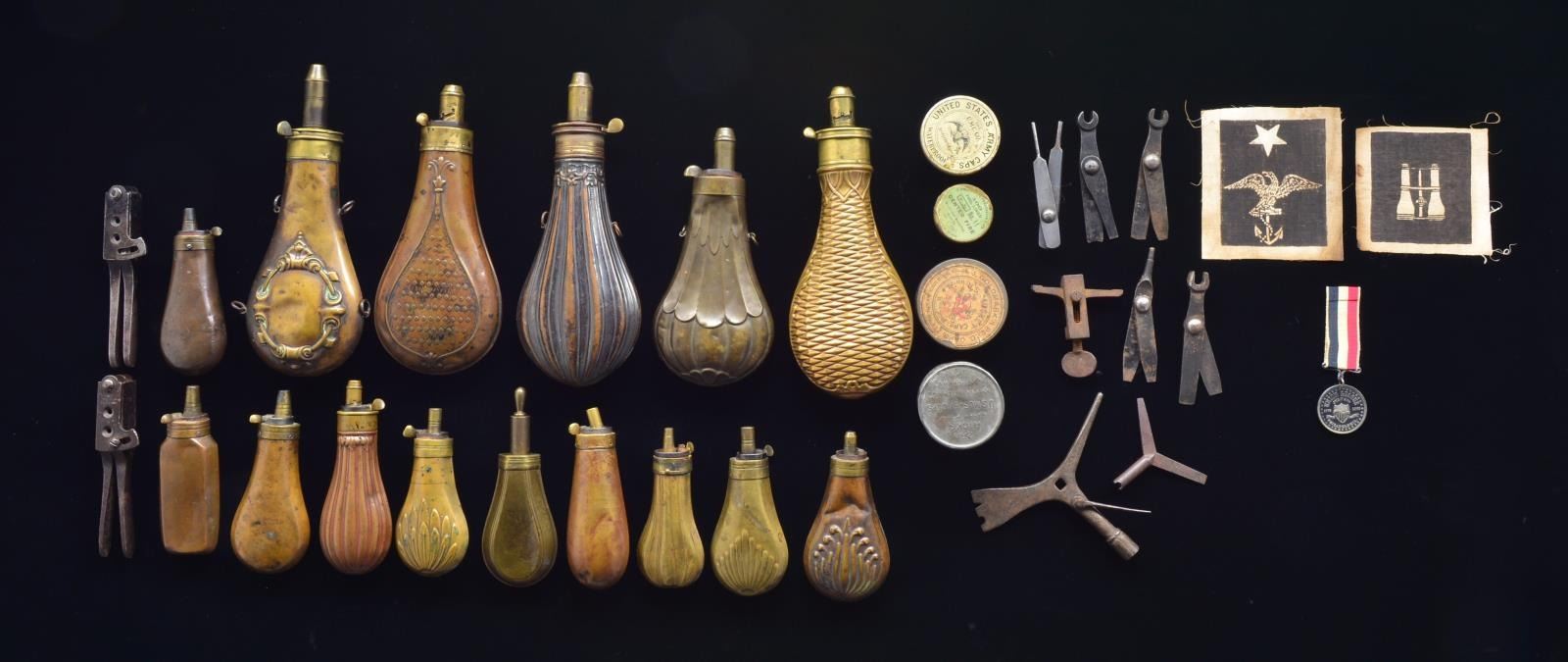 1) 9 Pistol sized powder flasks, various designs measuring 4-5", all functional & complete. 2) 6 Rifle flasks, all functional & complete. 3) Colt 2 cavity 36 cal. belt revolver mold, marked “COLTS PATENT” & “36B”. 4) Colt 31 cal. 2 cavity Pocket revolver mold, marked “COLTS PATENT” & “31PKT”. 5) 5 Labeled cap tins, all mostly full. 6) 8 -19th Century military gun tools. 7) Flat containing 2 circa 1870 US Naval rating badge stencils & a silvered union league badge dated July 4th 1863. PROVENANCE: Collection of Roger Ballard. (02-14706/JS). $600-800.