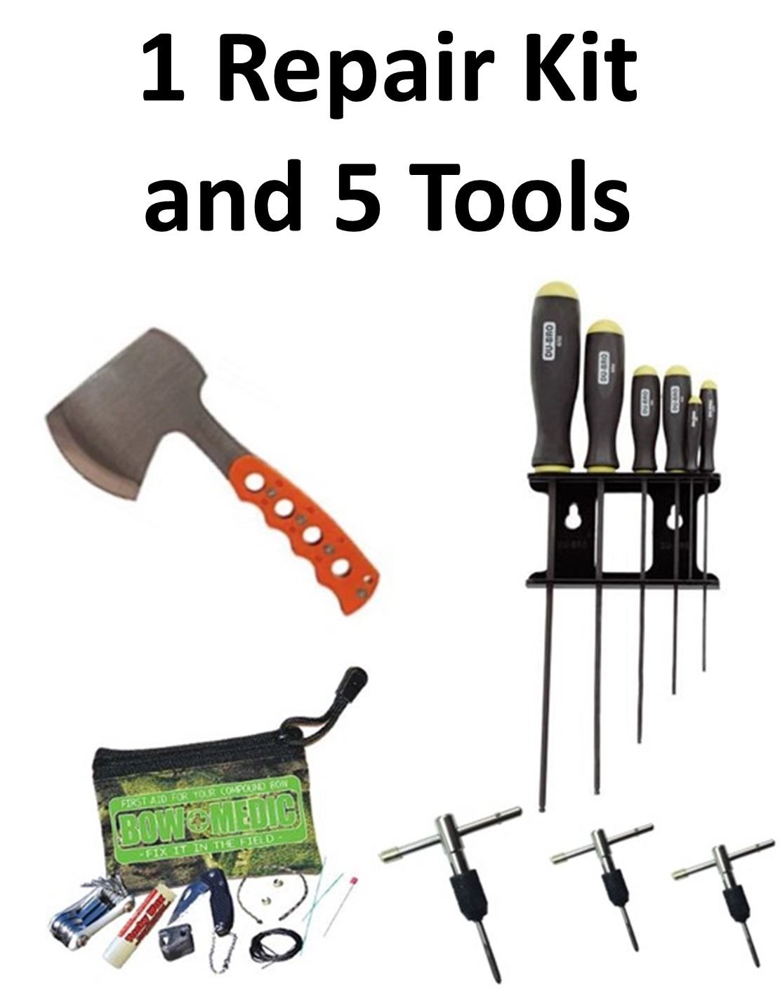 6 x Tools, 1-Rockvale Compact Axe - Orange, 1-6 Pc. Standard Ball Driver Set w/Holder, 1-Bow Medic Repair Kit, 1-, 1-Sight/Quiver Trhead Repair Tool 10-24, 1-Stabilizer/Rest Thread Repair Tool 5/16
