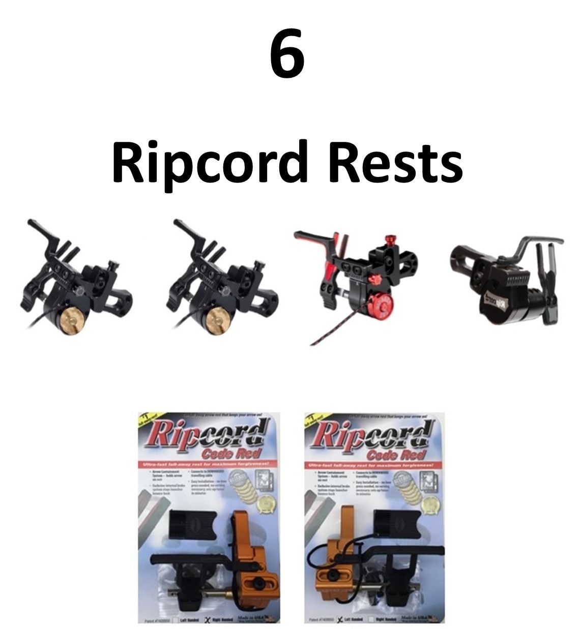 6 x Ripcord Rests, 3 x ACE Micro Adj, 2-Lost Camo RH, 1-Red RH, 1-SOS Black LH, 1-Copper RH, 1-Copper LH