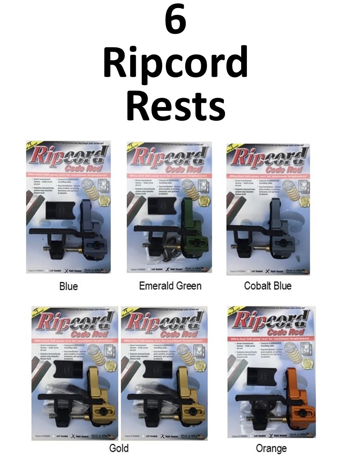6 x Ripcord Rests, 1-Blue RH, 1-Emerald Green RH, 2-Gold RH, 1-Cobalt Blue RH, 1-Orange RH
