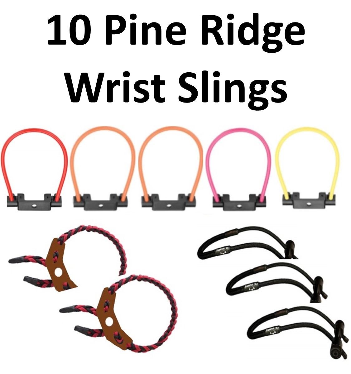 10 Pine Ridge Nitro Wrist Slings, 1 - Red, 2 - Orange, 1 - Pink, 1 - Yellow, 2 - Vista Braided Sling - Red / Black, 3 - LOC Outdoorz Stiffy Sling MaXX - Black