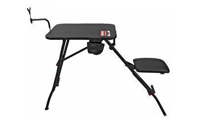 This ultra-steady shooting bench offers a stable, comfortable, and spacious shooting surface for target practice or field hunting. The 21"W X 28"L padded bench top provides comfort and a non-scratch surface protecting your gun, while also providing two additional gear pouches for ammunition or accessories. The gun rest is versatile to accommodate ambidextrous shooters and is adjustable to any position desired; also coated in durable non-scratch rubber. 12"W X 14"D X 1" thick seat folds up. Folds flat for space saving storage and easy transport. The bench as a whole weighs a mere 32lbs. with a weight limit of 300lbs.