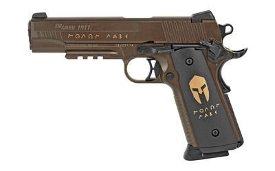 MOLON LABE engraved on the grips and slide speaks loudly for this SIG Air 1911 Spartan version. Oil-rubbed slide and frame bring the true history of the SIG SAUER original to life. With custom Spartan grips and skeletonized trigger, this BB gun will have you training like a warrior.